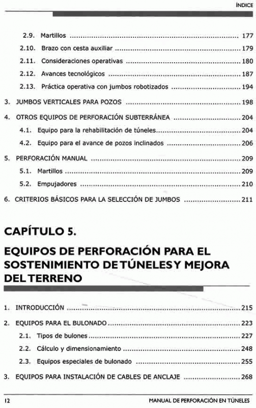 Está compuesto de cinco capítulos. Es objetivo de esta publicación describir los principios y los métodos de perforación de las rocas y los equipos actualmente disponibles en el mercado para la perforación de taladros, como son los destinados al refuerzo y sostenimiento de rocas mediante las diversas técnicas de bulonado e instalación de cables de anclaje, a al ejecución de paraguas de micropilotes en terrenos blandos o alterados y a las perforaciones que se precisan en las inyecciones para el tratamiento de los terrenos con vistas a su impermeabilización y mejora del comportamiento geomecánico.