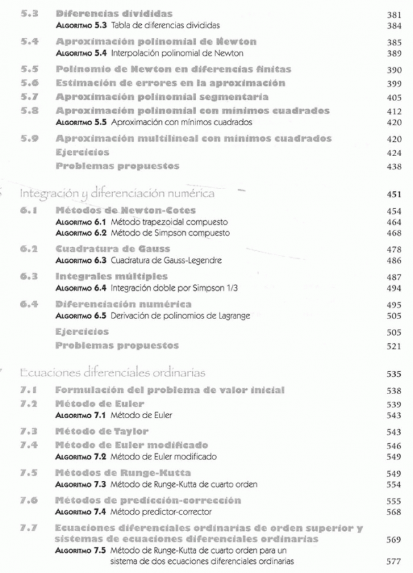 Errores, ecuaciones no lineales, matrices y sistemas de ecuaciones lineales, sistemas de ecuaciones no lineales, aproximación funcional e interpolacion, integración y diferencia numérica, ecuaciones diferenciales ordinarias, ecuaciones diferenciales parciales, respuestas a problemas seleccionados.