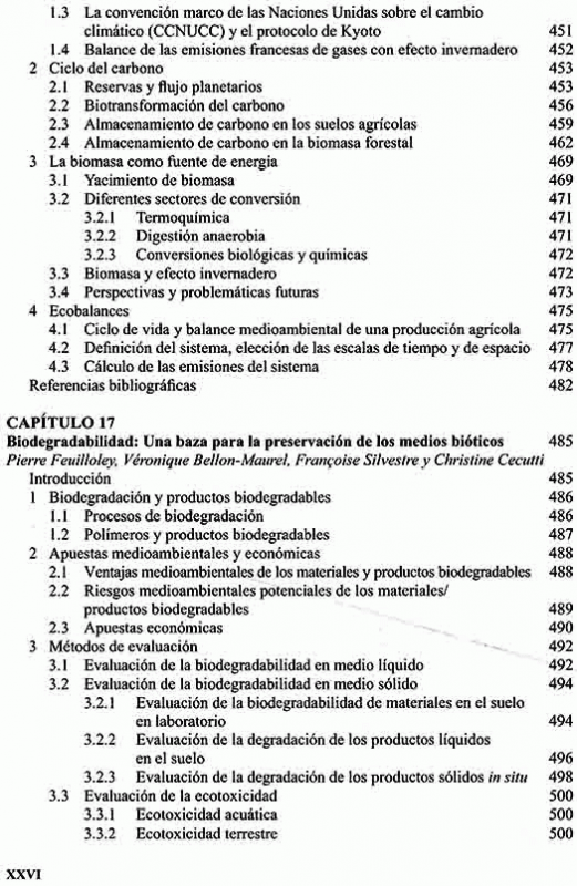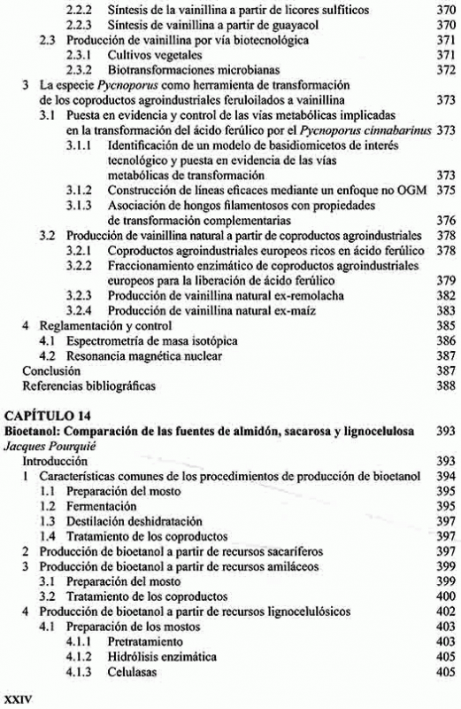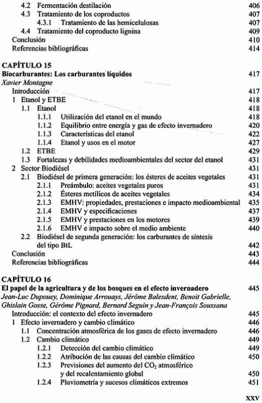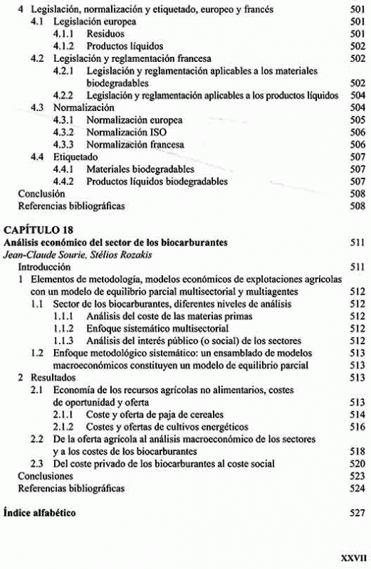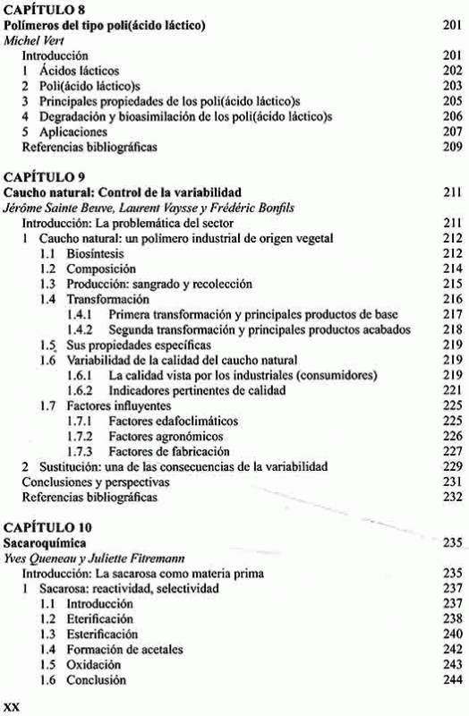 Evolución de la química, la disponibilidad de las tierras agrícolas francesas para usos energéticos, fraccionamiento de la biomasa lignocelulosica en synthons, manipulación de las vías de síntesis de los synthons orientados a la química verde, valoración no alimentarias de producciones agrícolas por vía biológica, fibras vegetales ¿retorno hacia el futuro?, materiales a base de almidón y de sus derivados, materiales proteicos, polímeros del tipo poli (ácido láctico), caucho natural: control de la variabilidad, sacaroquimica, propiedades tensioactivas y detergentes de biopolimeros antififilicos, lipoquimica, funcionalizacion de los compuestos vegetales feruloilados en vainillina por los basidiomicetos, bioetanol: comparación de las fuentes de almidón, sacarosa y lignocelulosa, biocarburantes: los carburantes líquidos, el papel de la agricultura y de los bosques en el efecto invernadero, biodegradabilidad: una baza para la preservación de los medios bióticos, análisis económico del sector de los biocarburantes.