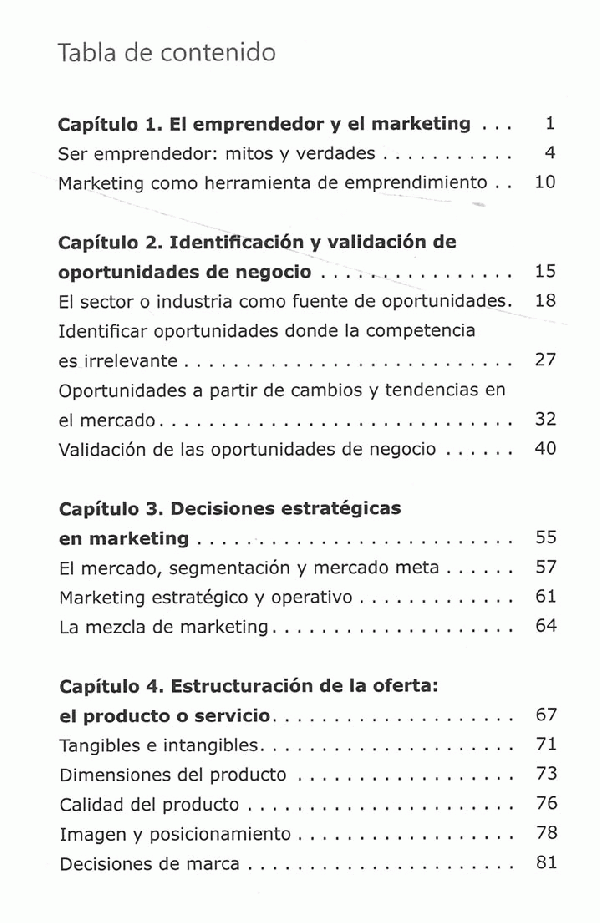 Una idea es un pensamiento, una impresión, un sentimiento o una ilusión, pero muchos emprendedores confunden eso con una gran oportunidad. Numerosos negocios fracasan, no porque los emprendedores no hayan trabajado duro, sino porque realmente no existía una oportunidad real en lo que comenzaron. El libro Marketing para emprendedores entrega elementos para analizar las necesidades reales del mercado como punto de partida para un negocio rentable y sostenible. Aquí se presenta un acercamiento que trasciende las 'fórmulas' o 'esquemas' para hacer empresa; además, los autores logran, en un lenguaje claro y preciso, describir un marco conceptual, analítico, metodológico y práctico, que permite identificar las necesidades del mercado y transformarlas en oportunidades de negocio para crear empresas sostenibles, eficaces, competitivas y lucrativas. Dentro de este proceso, el marketing se constituye en la herramienta clave, no sólo para validar esas ideas, sino para facilitar el diseño de los productos o servicios y -el desarrollo de estrategias necesarias para la comercialización de los mismos.El libro Marketing para emprendedores entrega elementos para analizar las necesidades reales del mercado como punto de partida para un negocio rentable y sostenible. Aquí se presenta un acercamiento que trasciende las 'fórmulas' o 'esquemas' para hacer empresa; además, los autores logran, en un lenguaje claro y preciso, describir un marco conceptual, analítico, metodológico y práctico, que permite identificar las necesidades del mercado y transformarlas en oportunidades de negocio para crear empresas sostenibles, eficaces, competitivas y lucrativas. Dentro de este proceso, el marketing se constituye en la herramienta clave, no sólo para validar esas ideas, sino para facilitar el diseño de los productos o servicios y -el desarrollo de estrategias necesarias para la comercialización de los mismos.Dentro de este proceso, el marketing se constituye en la herramienta clave, no sólo para validar esas ideas, sino para facilitar el diseño de los productos o servicios y -el desarrollo de estrategias necesarias para la comercialización de los mismos.
