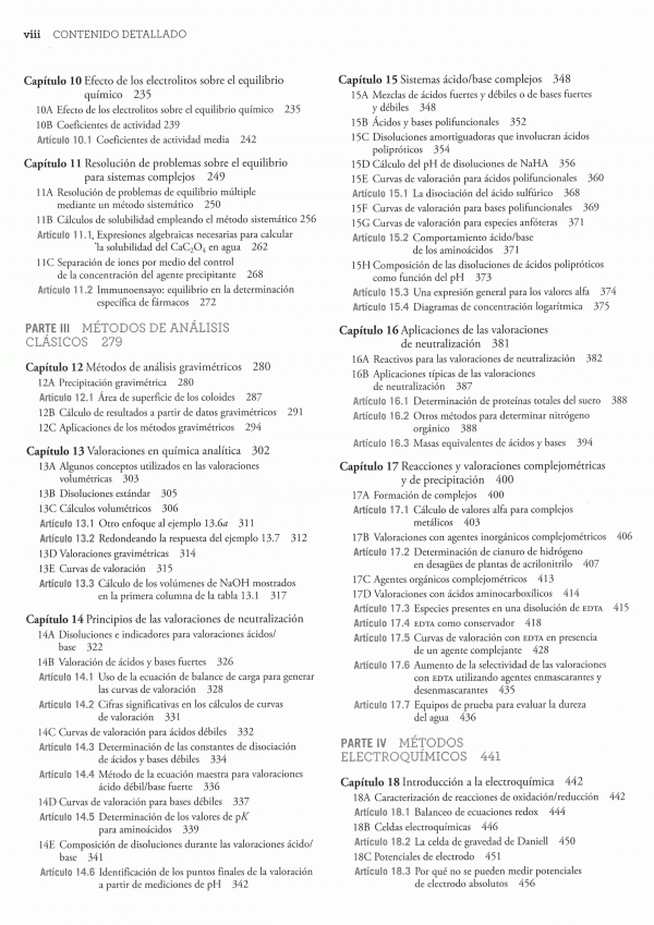 Fundamentos de química analítica, novena edición, es un libro de texto introductorio diseñado principalmente para cursos de nivel superior. En esta edición se han incluido aplicaciones en los campos de la biología, la medicina, las ciencias de materiales, la ecología, las ciencias forenses y otras áreas relacionadas. el objetivo primordial de este texto es proporcionar un profundo conocimiento sobre los principios químicos que son particularmente importantes para la química analítica. Busca que los estudiantes desarrollen y evalúen la precisión y la exactitud de los datos experimentales. los estudiantes desarrollarán las habilidades necesarias para resolver problemas analíticos cuantitativos y, cuando sea adecuado, utilizarán las poderosas herramientas de las hojas de cálculo para resolver problemas, efectuar cálculos y crear simulaciones de fenómenos químicos. También fomentará el desarrollo de habilidades para el laboratorio, las cuales les darán confianza y mejorarán su capacidad para obtener datos analíticos de alta calidad.