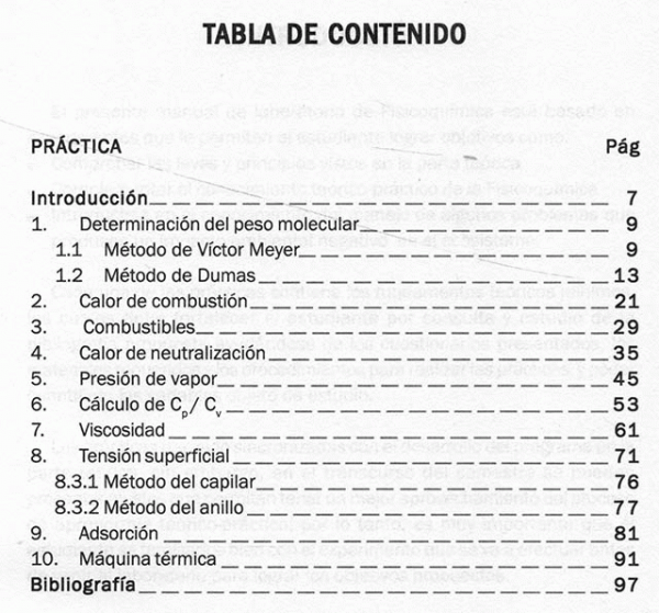 El presente manual de Fisicoquímica está basado en experimentos que le permiten al estudiante e interesado en el tema lograr objetivos como: Comprobar las leyes y principios vistos en la parte teórica Complementar el conocimiento teórico-práctico de la Fisicoquímica Introducirse en el conocimiento del manejo de algunos problemas que producen un impacto ambiental negativo en el ecosistema Cada una de las prácticas contiene los fundamentos teóricos mínimos, los cuales debe fortalecer el lector por consulta y estudio de la bibliografía propuesta, ayudándose de los cuestionarios presentados, los materiales requeridos y los procedimientos para realizar las prácticas, y poder cuantificar las variables objeto de estudio.