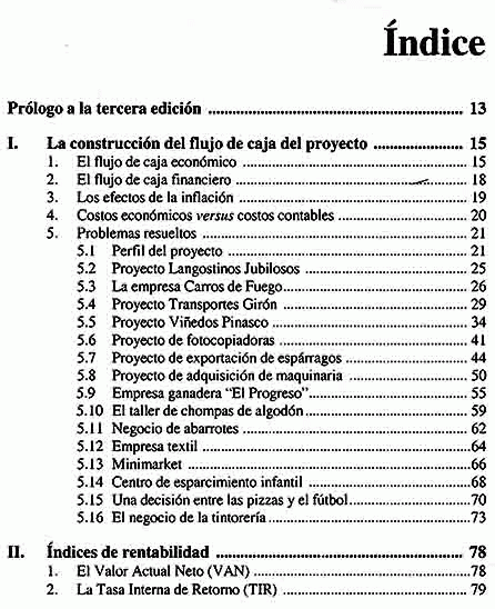 Ofrece diversos ejercicios resueltos de los tópicos que componen, principalmente, un curso de evaluación privada de proyectos, es decir, aquellos referidos a la evaluación de proyectos y fuentes de financiamiento bajo situaciones de certidumbre y riesgo: la elaboración de flujos de caja, el análisis de indicadores de rentabilidad bajo diferentes tipos de decisiones de inversión, la determinación del costo de oportunidad del capital, entre otros. Cabe mencionar que en esta tercera edición se incluyen básicamente una serie de ejercicios nuevos sobre dichos tópicos. Es más es un documento de consulta y referencia y una herramienta interesante para el estudio aplicado del curso.