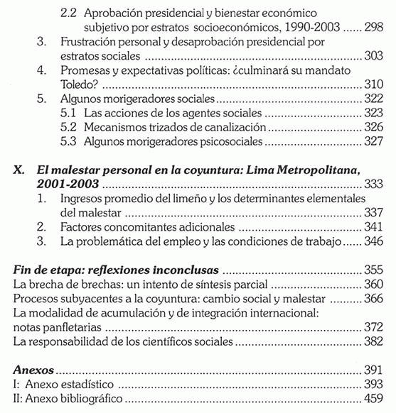 Resumen: Analiza la contradicción existente entre la bonanza macroeconómica anunciada por el Gobierno y el malestar microeconómico percibido por la ciudadanía. Muchos analistas económicos, políticos y público en general, han intentado explicar ese proceso, derivado del hecho de que la gran mayoría de personas y familias considera que su nivel de vida no sea satisfactorio ni mejore, a pesar de la tasa relativamente elevada de crecimiento del producto interno bruto. En este ensayo se estudia las relaciones entre el bienestar y la bonanza económica macro a lo largo del período que se extiende desde fines de los años 1980 y principios de 2004. En los diez capítulos que configuran este trabajo, se procede a ensayar un análisis global del tema, partiendo de las variables más comunes y simples que se acostumbran aducir para evaluar o estimar el ‘bienestar’, hasta llegar a algunas de las más complejas y discutibles.