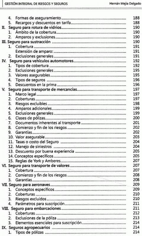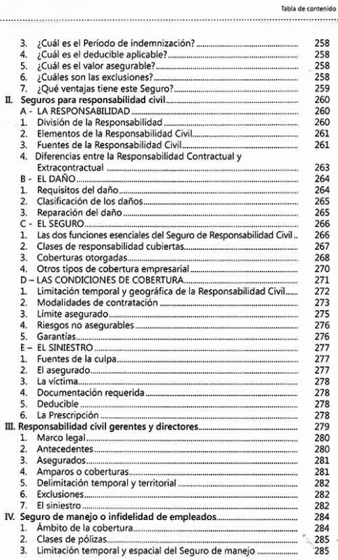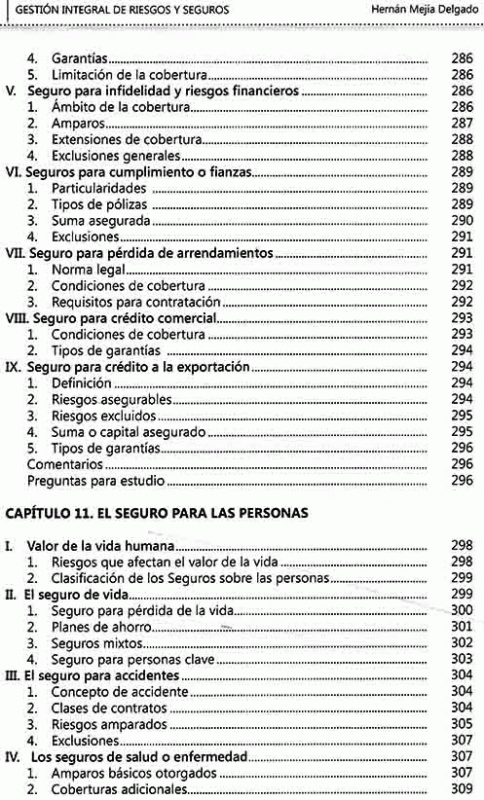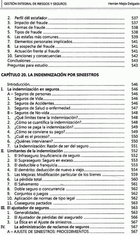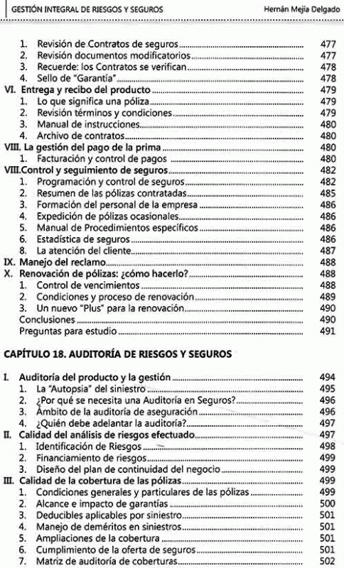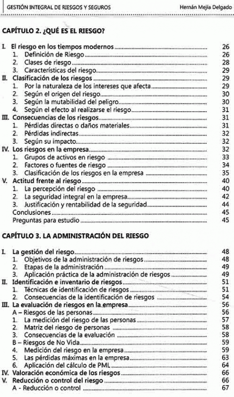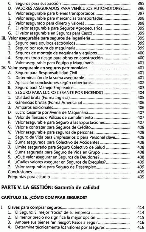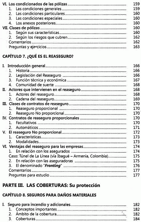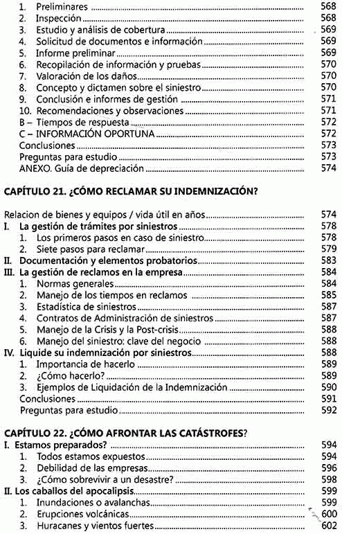En esta segunda edición se aborda la gerencia de riesgos proporcionando conocimientos sobre la prevención y mitigación, identificación de amenazas, gestión de seguros, diseño de pólizas, manejo de siniestros, gestión de reclamos y planes de recuperación, y continuidad del negocio. Expone casos reales para estudio, presenta gráficas explicativas, encuentra talleres con preguntas para autoestudio, además en el SIL se encuentran manuales técnicos de seguros y guías para planes de contingencia.Uniendo de una manera sencilla los diversos temas, explica de forma fácil y amena lo general y cotidiano que el gerente y/o empresario de hoy, requiere y necesita saber para la toma de decisiones respecto de una gestión integral del riesgo y los seguros.Dirigida a empresas de servicio, comercio e industria, empresarios, gerentes de riesgos y seguros, aseguradores, intermediarios y técnicos de seguros, ajustadores de pérdidas, estudiantes universitarios, profesionales y estudiosos en general.