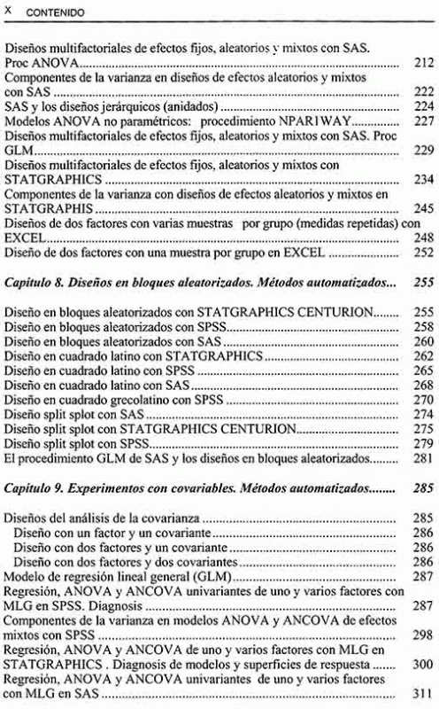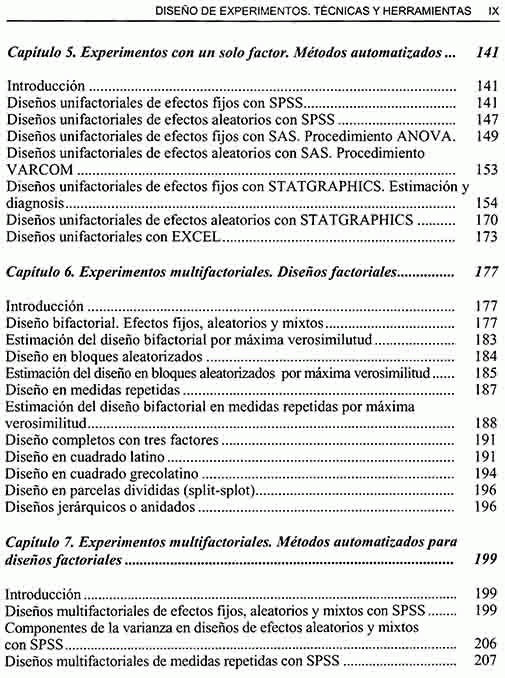 Experimentos de comparación simple, métodos automatizados, experimento con un solo factor (análisis de varianza), experimento con un solo factor (métodos automatizados), experimentos multifactoriales (diseños factoriales), experimentos multifactoriales (métodos automatizados para diseños factoriales), diseños de bloques aleatorizados (métodos automatizados), experimentos con covariables (métodos automatizados), diseños factoriales fraccionarios (superficies de respuesta), diseños multirrespuesta (modelos MANOVA y MANCOVA).