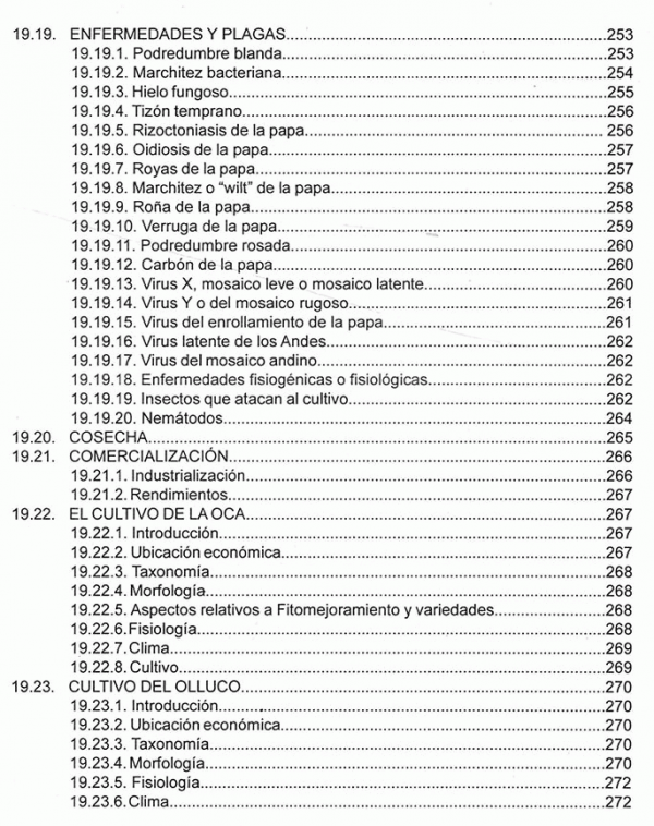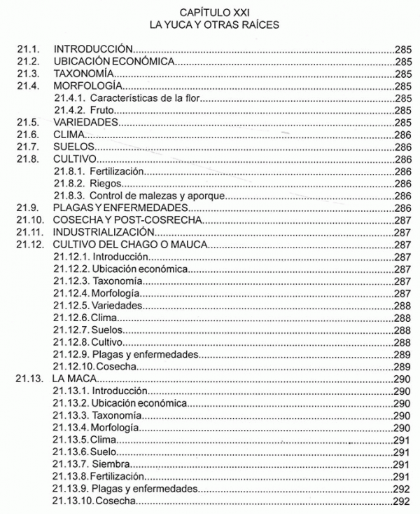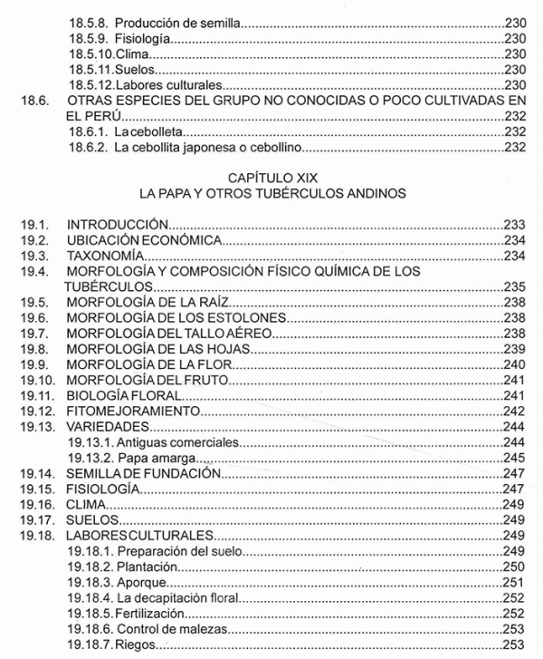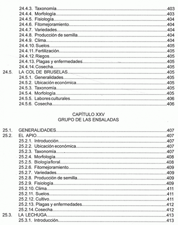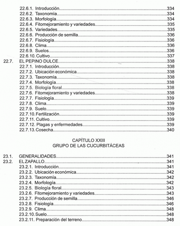 Las hortalizas y su cultivo, clasificación de las hortalizas, el suelo, la materia orgánica y su importancia en el cultivo de hortalizas, fertilizantes comerciales, multiplicación y propagación de las hortalizas, sistemas de cultivo de las hortalizas, instalación del cultivo en campo definitivo, rotación, sucesiones e intercultivo, el riesgo en el cultivo de hortalizas, los factores del clima y el cultivo de hortalizas, el clima y su influencia en el cultivo de hortalizas, la temperatura en el cultivo de hortalizas, control de malas hierbas en el cultivo de hortalizas, control de insectos y enfermedades, cosecha, pos cosecha, conservación y procesamiento de las hortalizas, holericultura especial, grupo de los bulbos, la papa y otros tubérculos andinos, el camote, la yuca y otras raíces, grupo de las solanáceas de frutos, grupo de las curcurbitaceas, grupo de las coles, grupo de las ensaladas, grupo de las verduras, grupo de las leguminosas, el maíz choclero, grupo de las especies aromáticas, grupo de las perennes, el cultivo de hongos comestibles.
