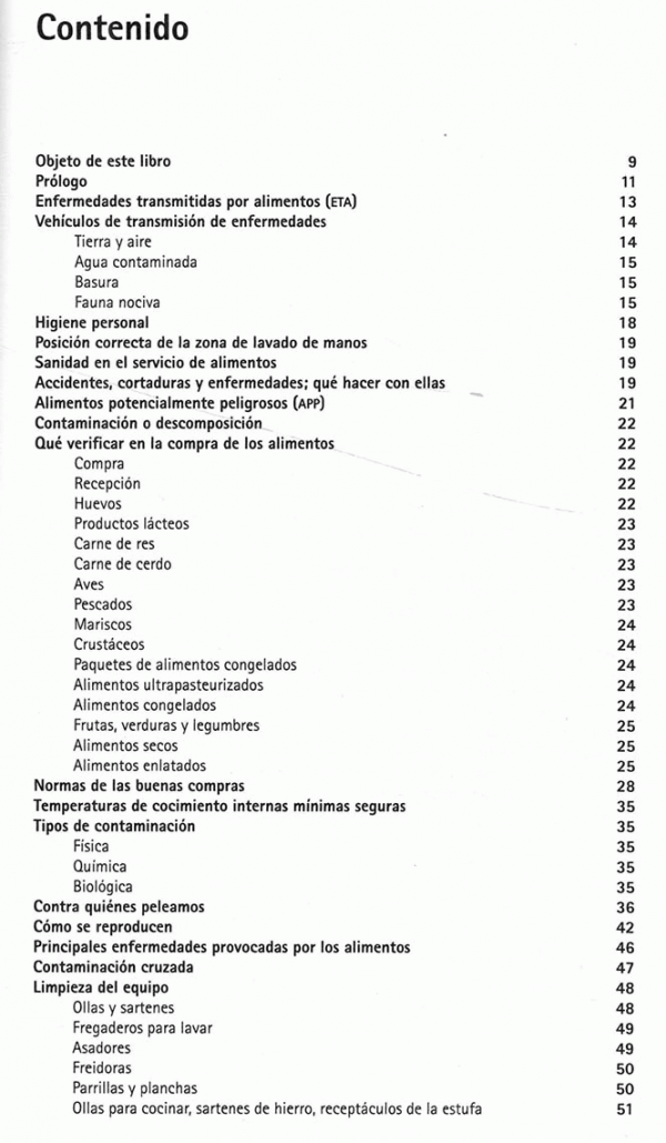 Enfermedades transmitidas por alimentos, vehículos de transmisión de enfermedades, higiene personal, posición correcta de la zona de lavado de manos, sanidad en el servicio de alimentos, accidentes, cortaduras y enfermedades, alimentos potencialmente peligrosos, contaminación o descomposición, que verificar en la compra de alimentos, normas de las buenas compras, temperaturas de conocimiento internas mínimas seguras, tipos de contaminación, contra quienes peleamos, principales enfermedades provocadas por los alimentos, contaminación cruzada, limpieza del equipo, métodos de limpieza, lavado y sanitizacion, temperaturas adecuadas para la desinfección, procedimiento para recibir la visita de suspensión, especificaciones sanitarias, la auditoria de distintivo H, otras normas y sistemas de higiene internacionales.