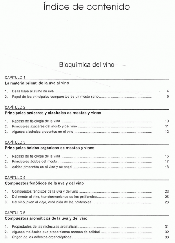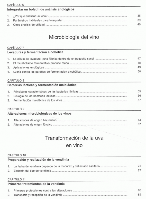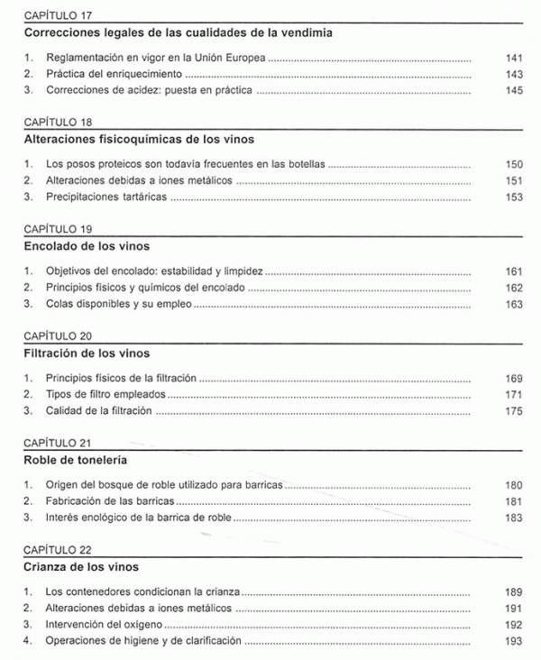 Bioquímica del vino: La materia prima: de la uva al vino - Principales azúcares y alcoholes de mostos y vinos - Principales ácidos orgánicos de mostos y vinos - Compuestos fenólicos de la uva y del vino - Compuestos aromáticos de la uva y del vino - Interpretar un boletín de análisis enológicos - Microbiología del vino: Levaduras y fermentación alcohólica - Bacterias lácticas y fermentación maloláctica - Alteraciones microbiológicas de los vinos - Transformación de la uva en vino: Preparación y realización de la vendimia - Primeros tratamientos de la vendimia - Vinificación de «vino blanco seco» - Vinificación de tintos - Elaboración de vinos rosados - Vinificación por maceración carbónica - Tecnología enológica: Empleo del SO2 en enología - Correcciones legales de las cualidades de la vendimia - Alteraciones fisicoquímicas de los vinos - Encolado de los vinos - Filtración de los vinos - Roble de tonelería - Crianza de los vinos - Preparación de la uva: Embotellado de calidad - Botella de vidrio - Tapón de corcho en vinos tranquilos.