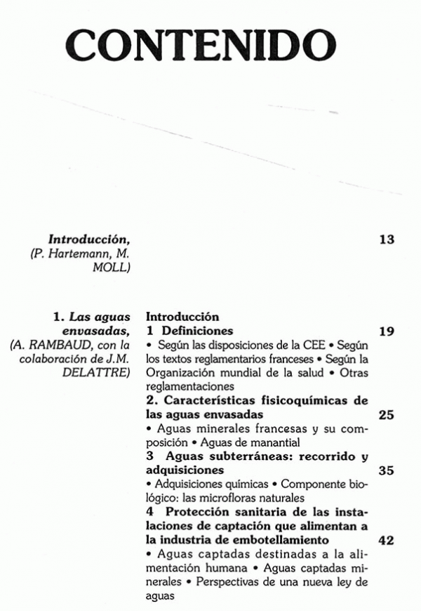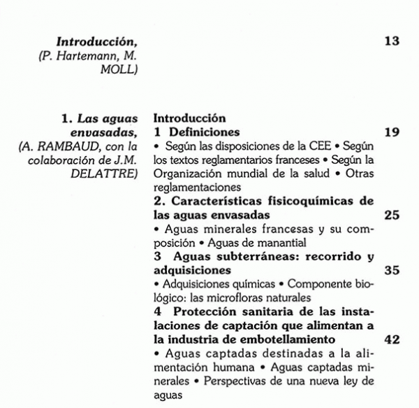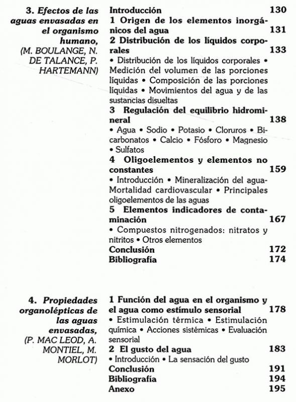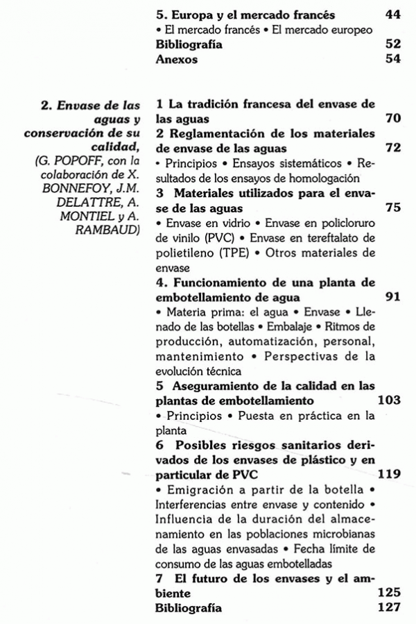 Características fisicoquimicas de las aguas envasadas, aguas subterráneas: recorrido y adquisiciones, protección sanitaria de las instalaciones de captación que alimentan a la industria de embotellamiento, Europa y el mercado francés, la tradición francesa del envase de las aguas, reglamentación de los materiales de envase de las aguas, materiales utilizados para el envase de las aguas, funcionamiento de una planta de embotellamiento de agua, aseguramiento de la calidad en las plantas de embotellamiento, posibles riesgos sanitarios derivados de los envases de plástico y en particular de PVC, el futuro de los envases y el ambiente.