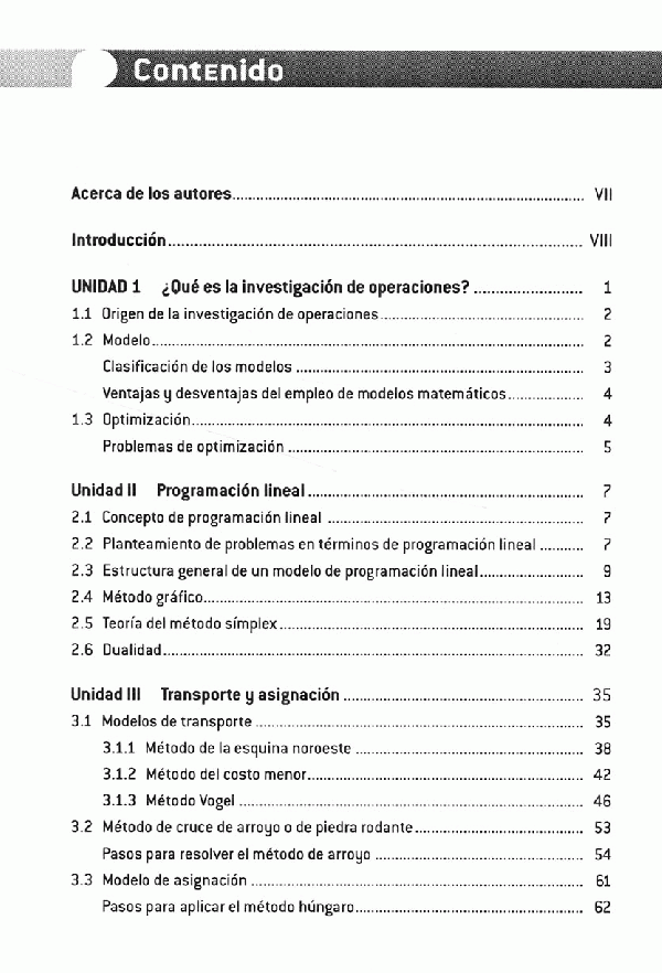 El objetivo principal de esta obra es servir como libro de consulta para el curso de investigación de operaciones, el cual se orienta a estudiantes de licenciatura y, fundamentalmente, a las áreas de económico-administrativo. Los prerrequisitos son: álgebra lineal, matemática y estadística.El texto proporciona suficiente material para el curso, tratando de desarrollar en cada unidad numerosos ejemplos basados en la realidad para una mejor compresión de los contenidos.
