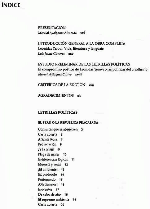 La sabia popular y acento modernista, unidos ala sátira y la denuncia, convirtieron a Leonidas N. Yerovi en ele poeta mas popular y admirado de lima , en las primeras décadas del siglo XX. La publicación de su obra completa es un justo reconocimiento a quien fue actor central en la constitución de la autonomía de la literatura política, en la función de la prensa moderna y en la renovación del teatro peruano.