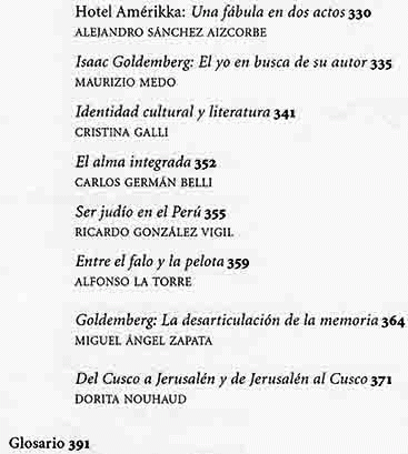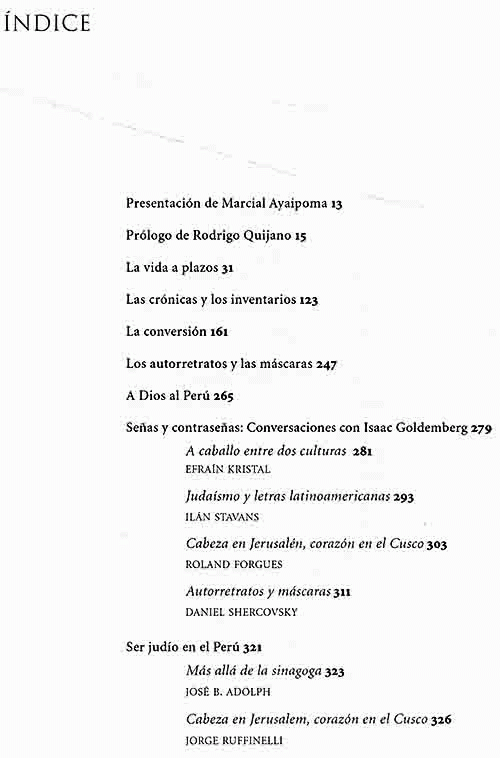 La narrativa y la poesía de Isaac Goldemberg constituyen uno de los puntos más altos de expresión de la creación mestiza judío - peruana. En Chepén, en Lima, en Jerusalén o en Nueva York, en múltiples escenas cotidianas, se presenta el testimonio fascinante de las asimilaciones y los intercambios entre la cultura judía y la peruana, elaborados a partir de las vivencias de un viajero incansable, poseído por el encanto y también por el desencanto del mundo que nos rodea. Isaac Goldemberg es reconocido por la critica internacional como uno de los mas destacados escritores dentro de aquella tradición