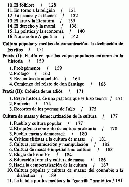 El libro reúne la casi totalidad de los ensayos que el autor escribió sobre el tema, los que abordan en conjunto los distintos problemas teóricos en busca de las definiciones necesarias: cultura popular y cultura de masas y cultura nacional, cultura universal y colonialismo cultural; arte y artesanía, universalismo y desarrollo en el mismo; la dinámica de los distintos de cultura.