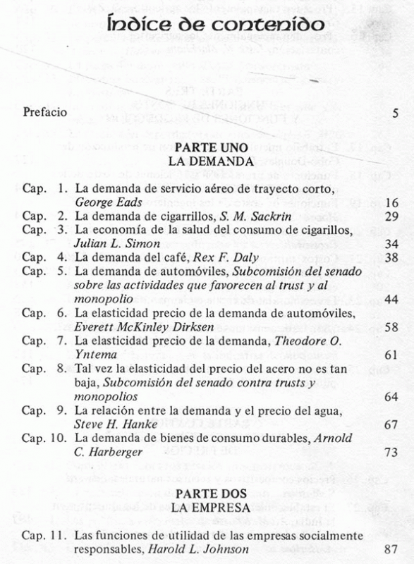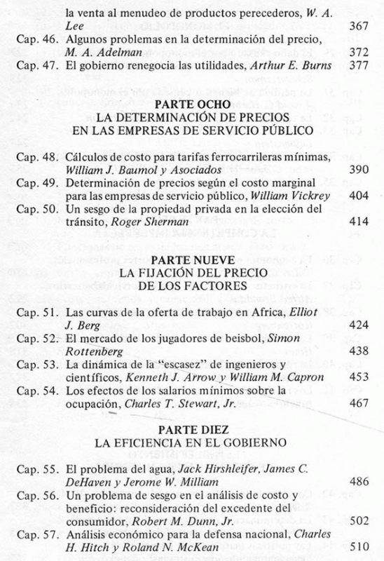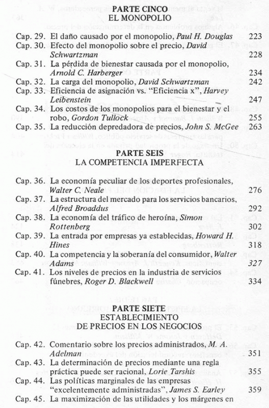 La demanda, la empresa, funciones de costo y funciones de producción, la fijación competitiva de precios, el monopolio, la competencia imperfecta, establecimiento de precios en los negocios, la determinación de precios en las empresas de servicio publico, la fijación del precio de los factores, la eficiencia en el gobierno.