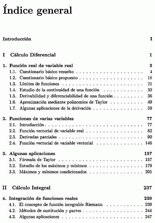 En el desarrollo de este texto hemos tenido en cuenta la distinta formación del alumnado cuando entra en la Universidad. Así ofrecemos en el texto un breve repaso sobre el estudio de las funciones reales de variable real, tanto desde el punto de vista del cálculo diferencial como del cálculo integral. Más tarde nos adentramos en el tratamiento de las funciones reales de varias variables reales, todo ello con una metodología basada en la resolución continua de ejercicios, planteando también problemas para resolver por parte del estudiante.