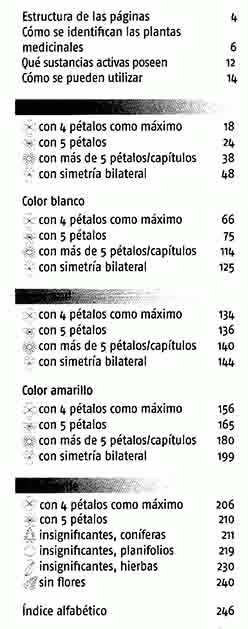 Hensel, W. Guía de identificación de más de 350 especies de plantas medicinales de toda Europa. Con una ficha de cada planta que incluye: una fotografía grande de toda la planta o una parte importante de ella; el nombre en castellano, el nombre científico, la familia a la que pertenece y los nombres vulgares, cuando los hay, en catalán, euskera, gallego, portugués, francés, italiano, inglés y alemán; la altura; los meses de floración; el hábitat; el recuadro Consejo de salud con recetas y usos de ungüentos, tinturas e infusiones; detalles de partes de la planta que son importantes para su identificación; muestra de una flor con sus características más importantes; clave de colores: cada uno de los cinco grupos principales está indicado con el color característico de cada flor; símbolo, los dibujos esquemáticos de cada flor facilitan la subdivisión dentro de los colores.