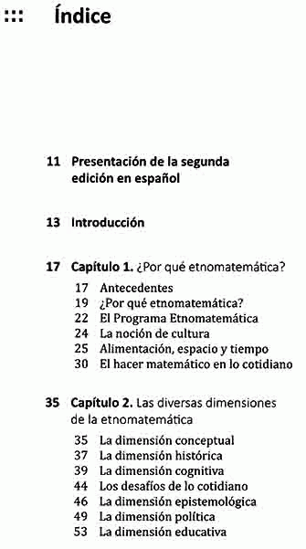 Etnomatemática es la matemática practicada por grupos culturales, tales como comunidades urbanas y rurales, grupos de trabajadores, grupos de profesionales, niños de cierta edad, sociedades indígenas y otros que se identifican por objetivos o tradiciones comunes. En el presente libro se procura dar una visión general de la etnomatemática, centrada sobre todo en los aspectos teóricos. La etnomatemática es considerada hoy en día como una subárea de la historia de la matemática y de la educación matemática, con un vínculo, muy natural, con la antropología y las ciencias de la cognición. El nombre de esta disciplina hace evidente la dimensión política de los temas que la ocupan..