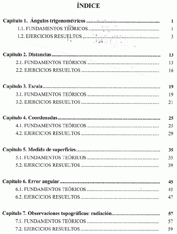 Este texto, complementario al libro de "Topografía. Instrumentación y observaciones topográficas", contiene una colección de diferentes tipos de ejercicios resueltos de la topografía básica: ángulos trigonométricos, distancias, escalas, cálculo de coordenadas, cálculo de superficies, error angular y ¿métodos básicos de observación topográfica: radiación, poligonal, nivelación geométrica y nivelación trigonométrica.