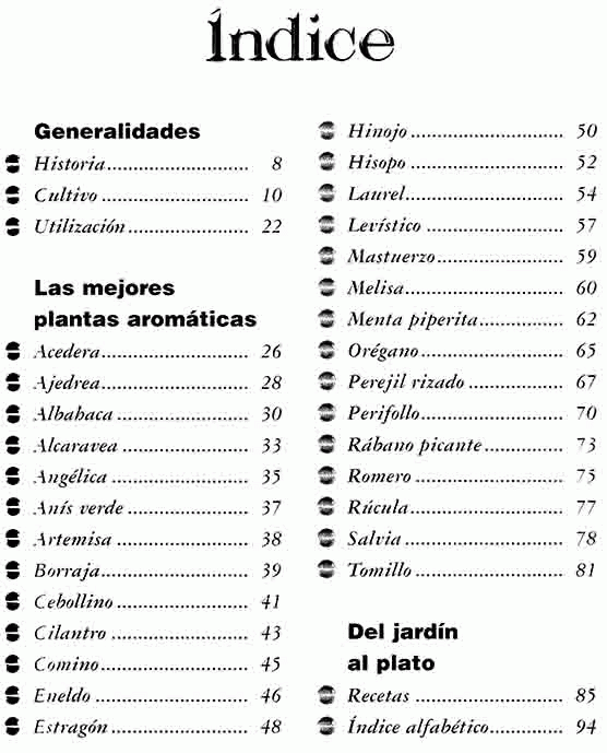 Las plantas aromáticas son, en general, fáciles de cultivar en el jardín, en una jardinera o en macetas. En este libro el lector encontrará una selección de las mejores plantas aromáticas, ordenadas alfabéticamente y con el nombres científico y los nombres vulgares, cuando los hay, en castellano, catalán, euskera, gallego, portugués, italiano, francés, inglés y alemán. Esta guía responde a todas las preguntas acerca de las plantas aromáticas: métodos de cultivo, enfermedades y parásitos, recolección y conservación, etc. Con numerosos dibujos que explican paso a paso las técnicas de cultivo y fotografías de cada especie. En las páginas finales, el lector encontrará sabrosas recetas que podrá condimentar con sus propias plantas aromáticas.