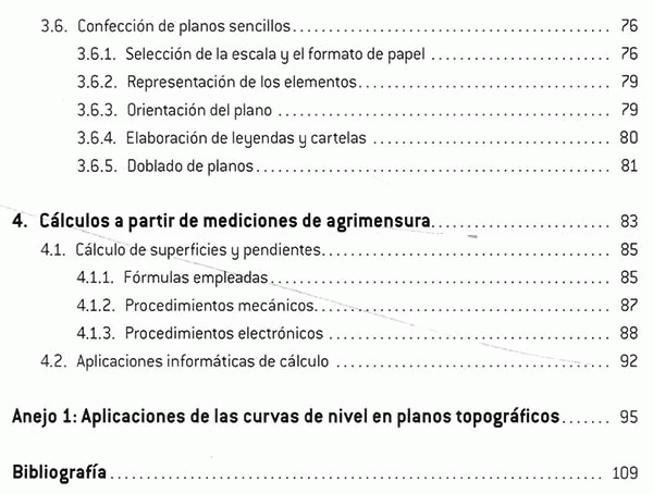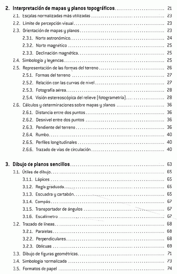 A lo largo de sus cuatro capítulos plantea, de un modo comprensible, los aspectos más importantes a considerar en la interpretación y el dibujo de mapas y planos topográficos. El primero estudia las unidades de medida y las razones trigonométricas más empleadas en trabajos de topografía, el sistema de planos acotados para representar mapas o planos topográficos, la utilización de sistemas de coordenadas para determinar la posición de un punto u otro elemento geométrico y el uso de las escalas numéricas y gráficas. El segundo plantea la orientación de mapas y planos topográficos, la simbología y las leyendas utilizadas en ellos, la representación de las distintas formas que puede tomar el terreno y los cálculos que se pueden realizar sobre un mapa o plano, destacando el trazado de caminos rurales. En el tercero se indican los útiles de dibujo técnico empleados en planimetría, el trazado de líneas y figuras geométricas en mapas o planos, la simbología normalizada usada en ellos y la confección sencilla de planos. El cuarto y último capítulo transmite los conocimientos básicos necesarios para calcular superficies y pendientes en mapas o planos, así como unas nociones básicas relativas a las aplicaciones informáticas más empleadas en ello.