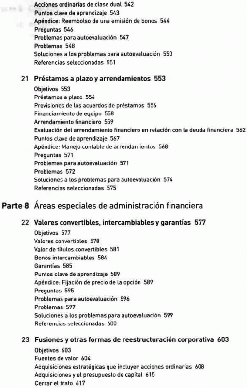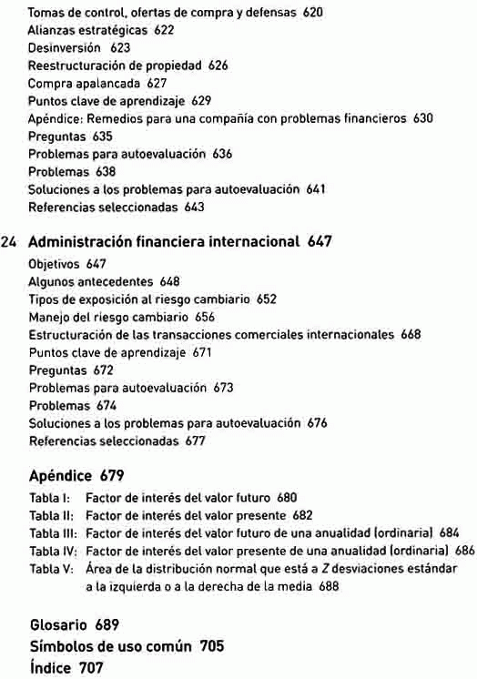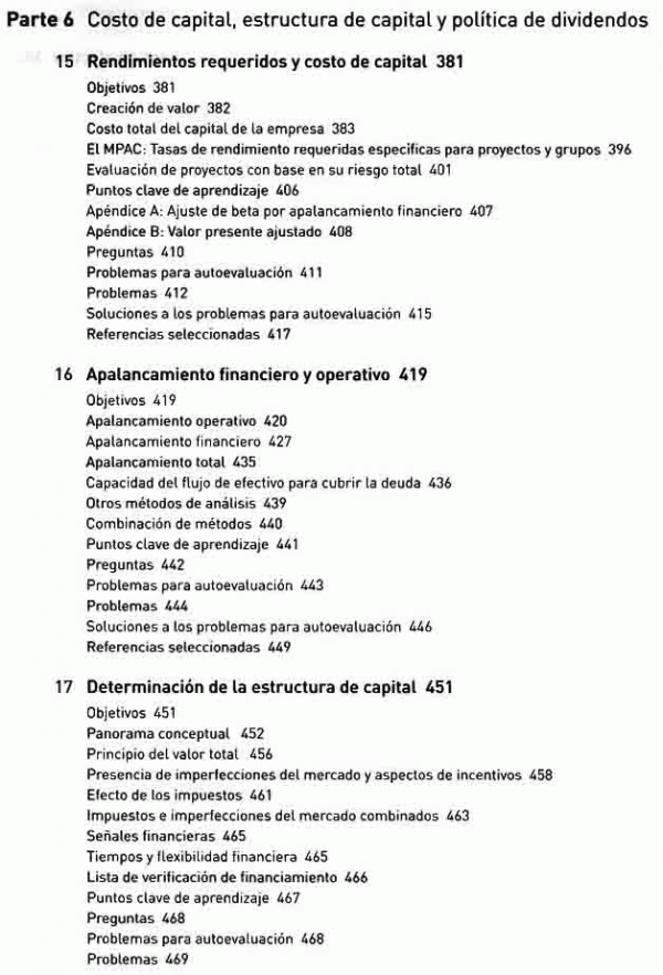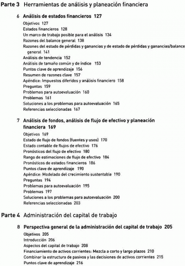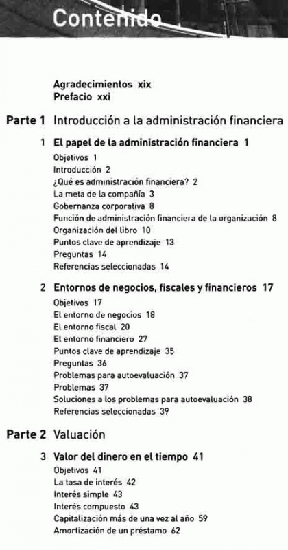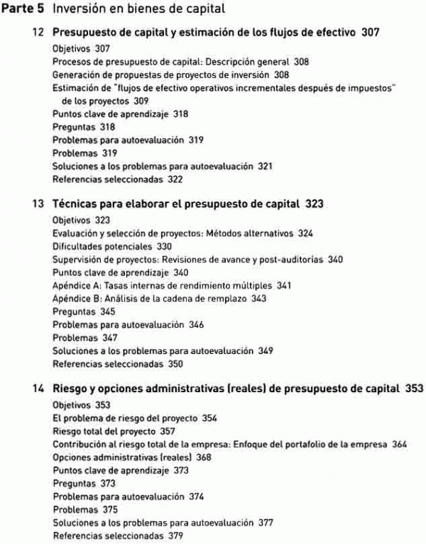 El objetivo de la decimotercera edición permitirá al lector adentrarse en el proceso de la toma de decisiones tendrá sobre la creación del valor . El libro introduce al lector las tres áreas de toma de decisiones mas importantes en l administratorio financiera: Decisión de inversión, financiamiento y administración de bienes . El contexto explora las finanzas y su relación con otras disciplinas afines, de una manera amigable y sencilla. Esta obra en su nueva edición maneja un estilo fácil de entender alejándose de temas no esenciales para facilitar la comprensión de la temática fundamental de la administración financiera. Esta edición mantiene la visión hacia la toma de decisiones que se ha manejado en las otras ediciones, pero además ahora presenta un enfoque internacional e introduce temas que resultan imprescindibles como los de gobierno corporativo, ética, globalización financiera y alianzas estratégicas con lo que se complementa el contenido y se proporciona una perspectiva internacional del manejo financiero. De la versión anterior. Se agregan capítulos como el relativo a la responsabilidad social y el concepto de sustentabilidad. También se agrega el tema de las Normas de contabilidad internacionales entre otros, que se hacen temas invaluables dadas las condiciones de crisis que algunas empresas han enfrentado. Estructura de la obra el objetivo de esta nueva edición es permitir al lector adentrarse en el proceso de toma de decisiones de finanzas e interpretar el efecto que esas decisiones tendrán sobre la creación de valor. El libro se divide en ocho partes que introducen al lector a las tres áreas de toma de decisiones más importantes en administración financiera: 1) decisiones de inversión, 2) financiamiento y, 3) administración de bienes. Hay muchos cambios importantes en esta nueva edición, entre estos destaca la actualización del Material referente a las instituciones que es necesario para comprender el entorno en que se toman las decisiones de finanzas. El libro continúa fortaleciéndose en su alcance internacional. Se agregaron nuevas secciones, ejemplos y recuadros especiales que se centran en las dimensiones internacionales de la administración financiera. También se dedica atención a modernizar la cobertura y a expresar con mayor claridad las ideas fundamentales en todos los capítulos: el capítulo 1, el papel de la administración financiera, se benefició con un análisis expandido de la responsabilidad social corporativa para incluir el concepto de sustentabilidad. El capítulo 6, análisis de Estados financieros, se ha beneficiado con la adición de un análisis de los intentos por lograr la convergencia de los estándares contables alrededor del mundo. El capítulo 13, técnicas para elaborar el presupuesto de capital, incluye una sección dedicada al análisis de sensibilidad para examinar la posible incertidumbre en torno al desembolso inicial relacionado con un proyecto, mientras que el capítulo 19, el mercado de capital, introduce una variedad de términos y conceptos nuevos que surgieron en la reciente reforma de oferta de valores de la sec. En el capítulo 20, deuda a largo plazo, acciones preferenciales y acciones ordinarias, se presenta un estudio amplio del poder, el poder electrónico y la disputa sustitutiva, seguido de Material nuevo dedicado a la votación por mayoría, la votación por mayoría relativa y los procedimientos modificados de votación por mayoría y votación acumulativa. En el capítulo 21, Préstamos a plazo y arrendamientos, se advierte al lector sobre cambios inminentes y tal vez drásticos en la contabilidad de arrendamientos. Las revisiones a los cambios recientes en el manejo contable de las fusiones y adquisiciones se estudian en el capítulo 23, fusiones y otras formas de reestructuración corporativa. El último capítulo del libro, el cual se dedica a la administración financiera internacional, se actualizó y se le agregaron numerosos conceptos nuevos.