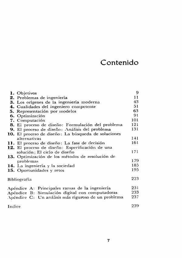 Problemas de ingeniería - Los orígenes de la ingeniería moderna - Cualidades del ingeniero competente - Representación por modelos - Optimización - Computación - El proceso de diseño : formulación del problema - El proceso de diseño : análisis del problema - El proceso de diseño : la búsqueda de soluciones alternativas - EL proceso de diseño : la fase de decisión - El proceso de diseño : especificación de una solución; el ciclo de diseño - Optimización de los métodos de resolución de problemas - La ingeniería y la sociedad - Oportunidades y retos.