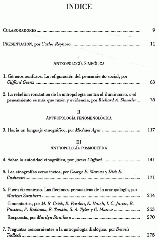 Hace unos años, por iniciativa de Clifford Geertz, la antropología volvió a trascender sus fronteras para buscar un intercambio con otros ámbitos de la actividad intelectual, no necesariamente científicos. Expansiones parecidas se habían manifestado pocas veces, al impulso de importantes giros e inflexiones en el pensamiento: con Malinowski, en la querella alrededor de Edipo, con Lévi-Strauss y el estructuralismo, acaso también con Margaret Mead. Hoy somos testigos de una circunstancia casi opuesta en la que una ciencia, hasta hace poco dotada de la seducción de lo exótico, se precipita en lo que ha dado en llamarse la condición posmoderna. Esta compilación documenta el surgimiento de una antropología cada vez más consciente de que los colapsos que anticipa la idea misma de posmodernidad involucran también su propia caída. No es sólo la antropología la que se encuentra ante la amenaza de un vacío interior. Habrá sin duda un arrastre en cadena, porque otros espacios del saber (el psicoanálisis, la crítica cultural, el feminismo) se habían acostumbrado a confiar en una ciencia a la que creían fuerte. Los textos polémicos que aquí se presentan se escalonan en una serie que comienza con el proyecto (premonitoriamente débil) de erigir una ciencia interpretativa; el tránsito a la antropología posmoderna parece inexorable. Se trata, para algunos, de los primeros pasos, hacia una honda transformación científica; para otros, en cambio, tenemos ante los ojos el testimonio de la muerte de una ciencia.