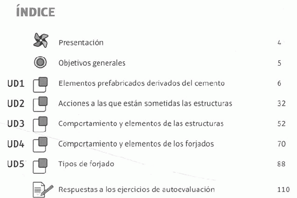 Este manual trata las acciones y cargas a las que está sometida la estructura del edificio, los elementos constructivos que la componen y la función de los mismos, haciendo especial hincapié en los forjados y sus elementos, tanto los que se ejecutan en la obra como los que son de fabricación industrial, también llamados prefabricados.