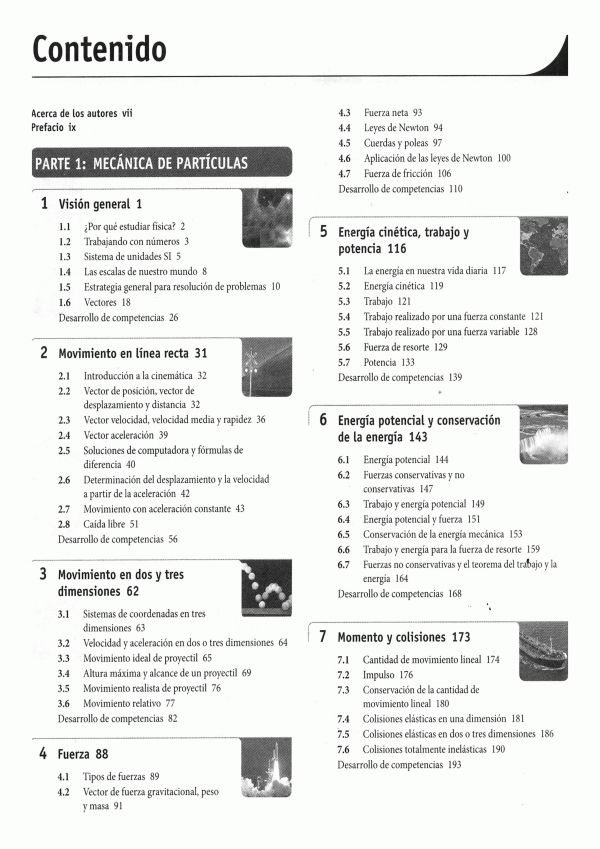 Mecánica de partículas puntuales, objetos extensos, materia y movimiento circular, oscilaciones y ondas, física térmica.
