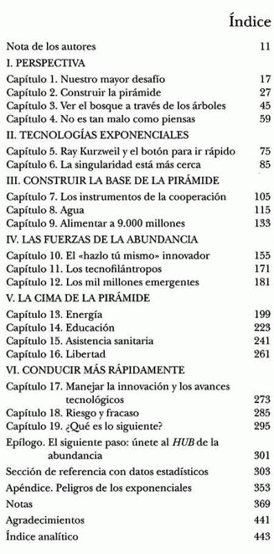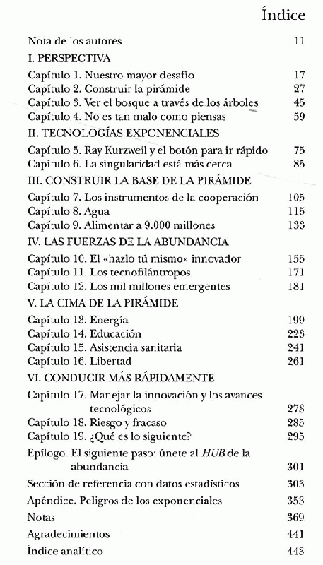 Desde los orígenes de la humanidad, unos pocos privilegiados han vivido en marcado contraste con la mayoría, muy pobre. La opinión más común es que la distancia que separa a unos de otros es imposible de superar. Sin embargo la distancia se está estrechando...y rápido.En Abundancia, el empresario del espacio convertido en pionero de la innovación, Peter H. Diamandis y el galardonado escritor de temas científicos Steven Kotler documentan cómo el progreso en inteligencia artificial, robótica, computación infinita, redes de banda ancha, manufactura digital, nanomateriales, biología sintética y muchas otras tecnologías que están creciendo exponencialmente nos permitirán obtener en las próximas dos décadas unos avances muy superiores a los que hemos conseguido en los doscientos años anteriores. Pronto tendremos la capacidad de alcanzar y superar las necesidades básicas de cada hombre, mujer y niño del planeta. La abundancia para todos está a nuestro alcance.En este apasionante antídoto contra el pesimismo imperante, los autores exploran cómo cuatro fuerzas emergentes -las tecnologías exponenciales, el innovador"hazlo tú mismo", los tecnofilántr.