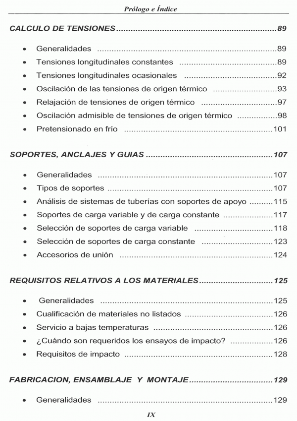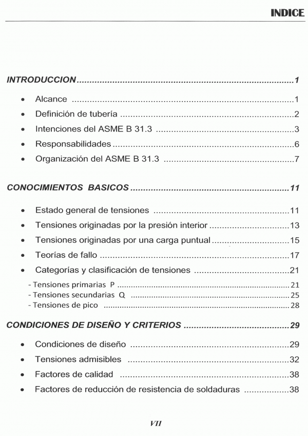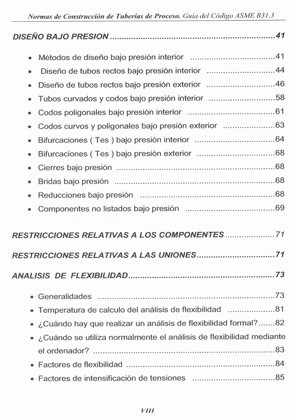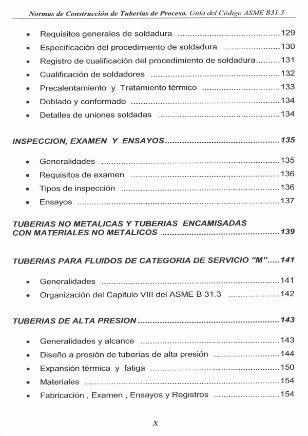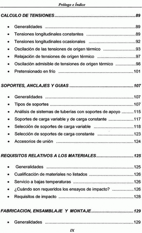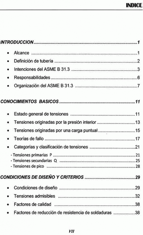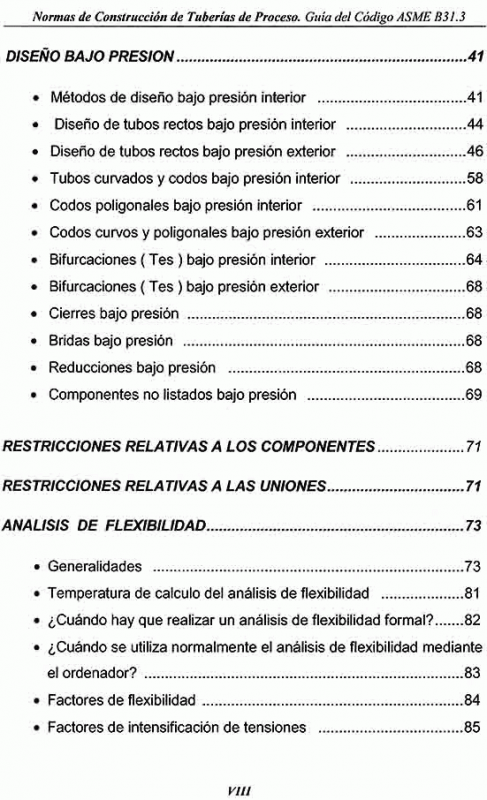 El Código ASME B31.3 incluye: Lista de materiales de tuberías aceptados, con sus tensiones admisibles en función de la temperatura y otras notas con información adicional.- Tabla de estándares que indica componentes aceptados en la construcción de sistemas de tuberías.- Una guía para la determinación de los niveles de tensiones de tubería seguros.- Requisitos de examen de soldaduras y requisitos de pruebas de presión parta antes del arranque.