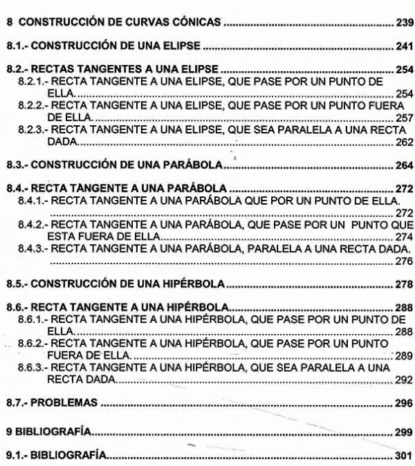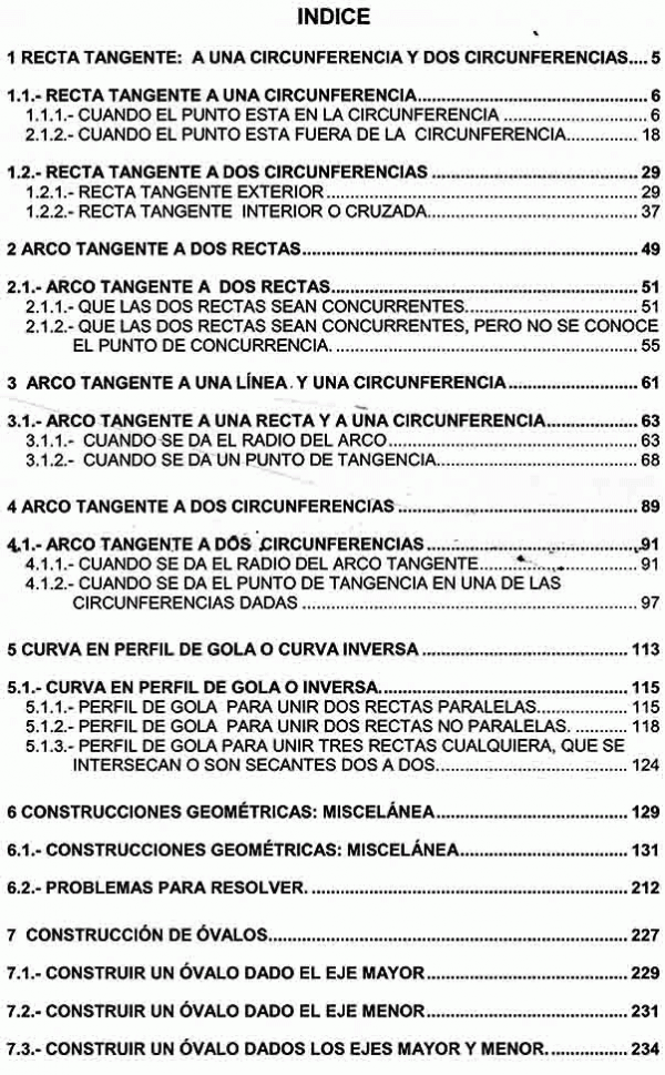 Recta tangente: A una circunferencia y dos circunferencias - Arco tangente a dos rectas - Arco tangente a una línea y una circunferencia - Arco tangente a dos circunferencias - Curva en perfil de gola o curva inversa - Construcciones geométricas: miscelánea - Construcción de óvalos - Construcción de curvas cónicas - Bibliografía.