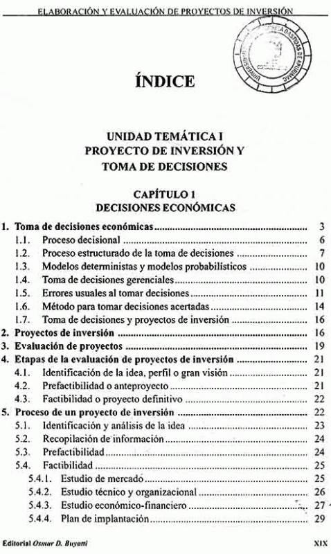En términos globales pueden mencionarse cuatro aspectos fundamentales que se atienden en esta obra: Enfoque orientado a la toma de decisiones empresariales: Cuando se habla de proyectos de inversión se asume la idea que se debe partir de la definición de un problema de tipo económico y financiero. Esta concepción es correcta. pero incompleta. Los proyectos de inversión son herramientas de planeamiento que exigen: identificar las variables relevantes en juego. establecer una secuencia lógica de relaciones entre las mismas y proveer un modelo racional que permita desarrollar correctamente al proceso de toma de decisiones en la empresa. En definitiva. un proyecto de inversión es un medio para la toma de decisiones y. aunque no garantiza el éxito. es más probable tomar decisiones exitosas si se dispone de un esquema metódico y razonado.Énfasis en los aspectos estratégicos involucrados: Muchas veces los fundamentos que explican y justifican una decisión se dan por sobreentendidos. en tanto que las implicancias operacionales son sometidas a un tratamiento profundo.