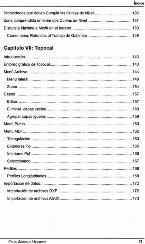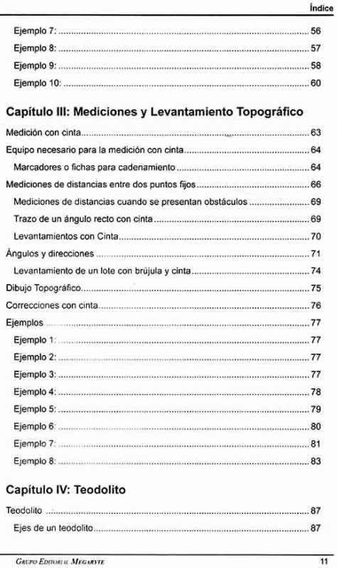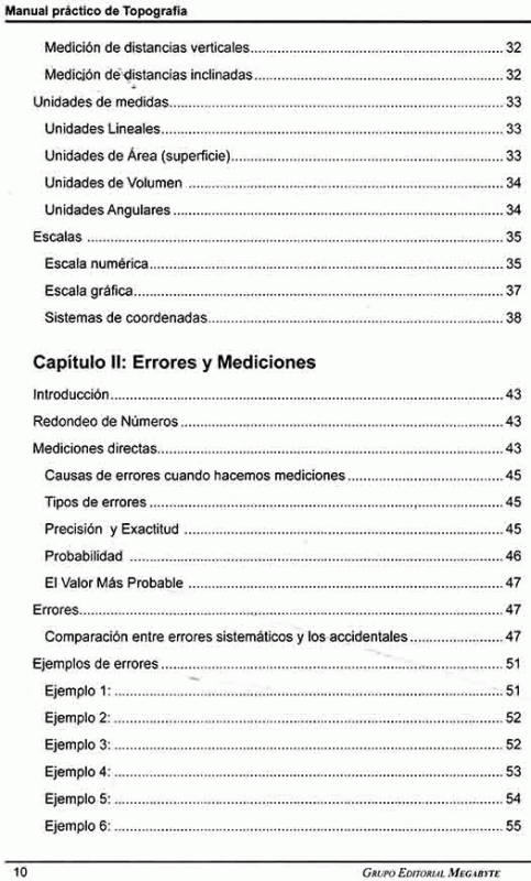 I. Nociones generales -- II. Errores y mediciones topográficas -- III. Mediciones y levantamientos topográficos -- IV. Teodolito -- V. Altimetría -- VI. Criterios importantes en la topografía -- VII. Topocal.