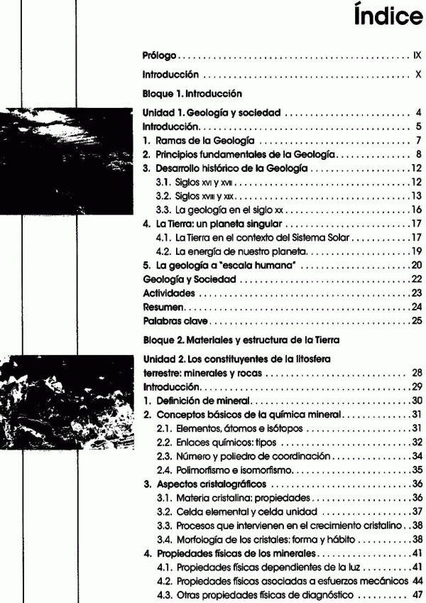 Se trata de un texto que recoge de manera sencilla y directa los temas relativos a la asignatura de Geología de 2º de Bachillerato, con el objetivo de convertirse frente a otros manuales de la competencia con niveles poco adecuados para el público al que se destina, en un instrumento válido para el docente. Como características más importantes destacan: la estructura de cada uno de sus temas que comprende, además del habitual texto de estudio, cuatro apartados: "Geología y Sociedad", que nos acerca a la vertiente más práctica de la Geología y a su importancia en el mundo actual; Actividades, que permiten la comprobación de que se ha comprendido el contenido; Resumen, con el objetivo de fijar los conceptos más importantes, y una relación de Palabras Clave, fundamentales para la comprensión del texto, la presentación de materiales absolutamente actualizados (incorporando los últimos avances que la ciencia ha obtenido recientemente) y la recopilación de materiales gráficos que apoyan de manera definitiva los contenidos, facilitando su comprensión y estudio.
