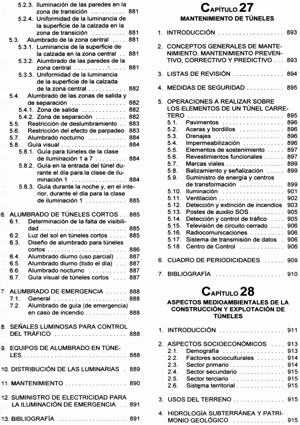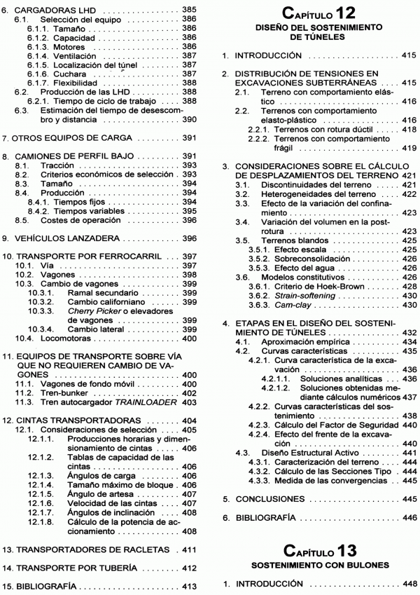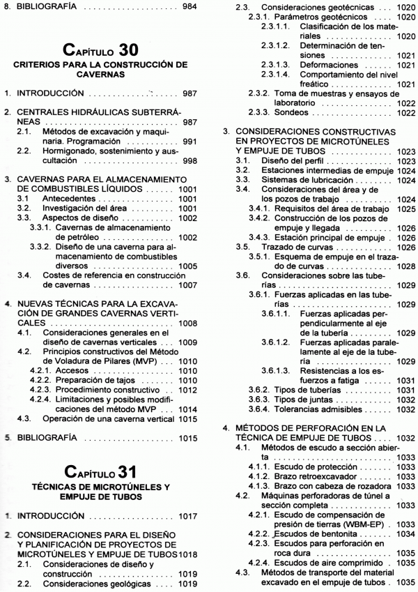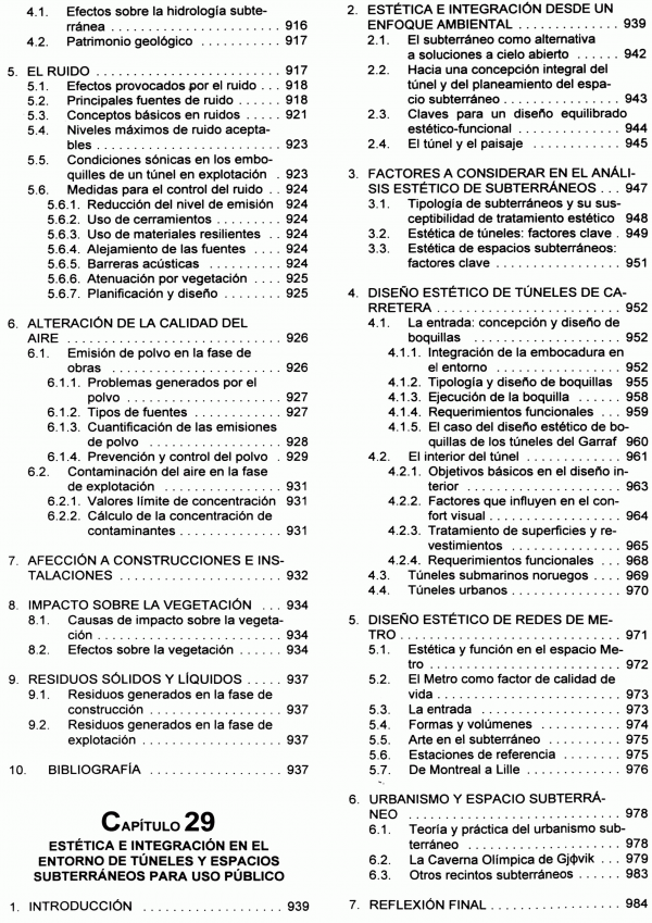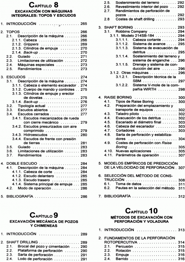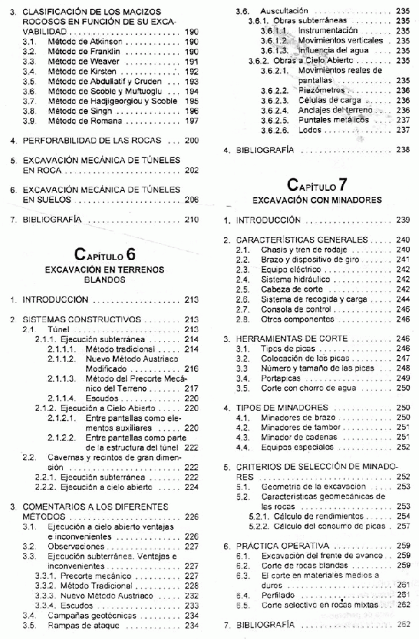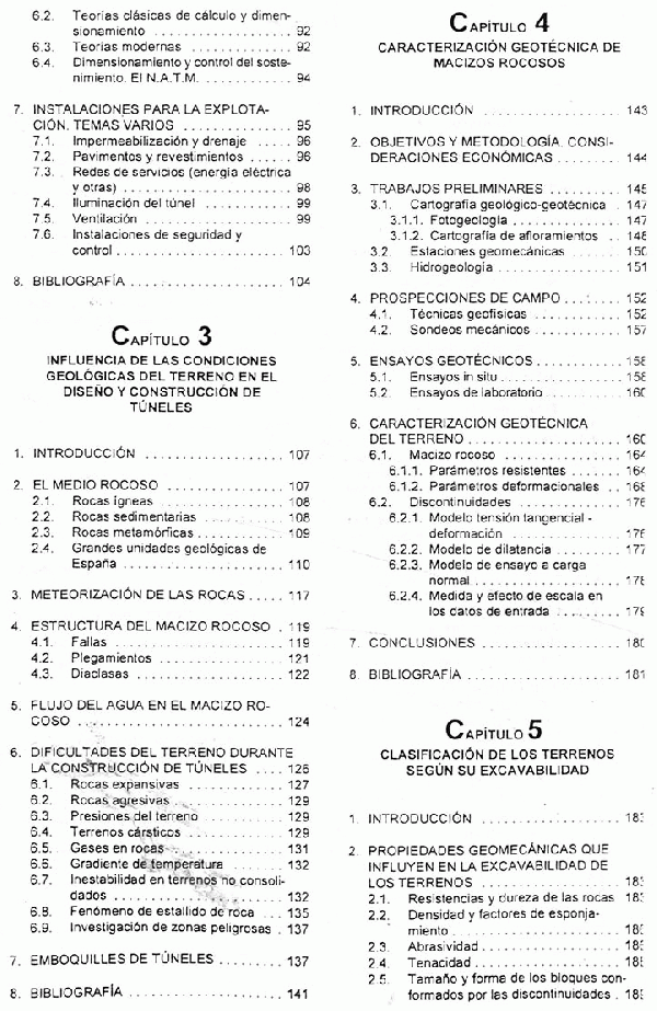 En este Manual se describen todos los aspectos relacionados con el diseño, construcción y explotación de túneles y otras obras subterráneas, desde las técnicas de reconocimiento y caracterización de los terrenos, los métodos de excavación y desescombro subterráneos, pasando por los criterios de diseño del sostenimiento y revestimiento de túneles, los tratamientos de mejoras de los macizos rocosos, los trabajos de electrificación y ventilación, las medidas de seguridad, etc., hasta las perspectivas de futuro de las diferentes obras subterráneas y la incorporación de criterios ambientales en este tipo de proyectos