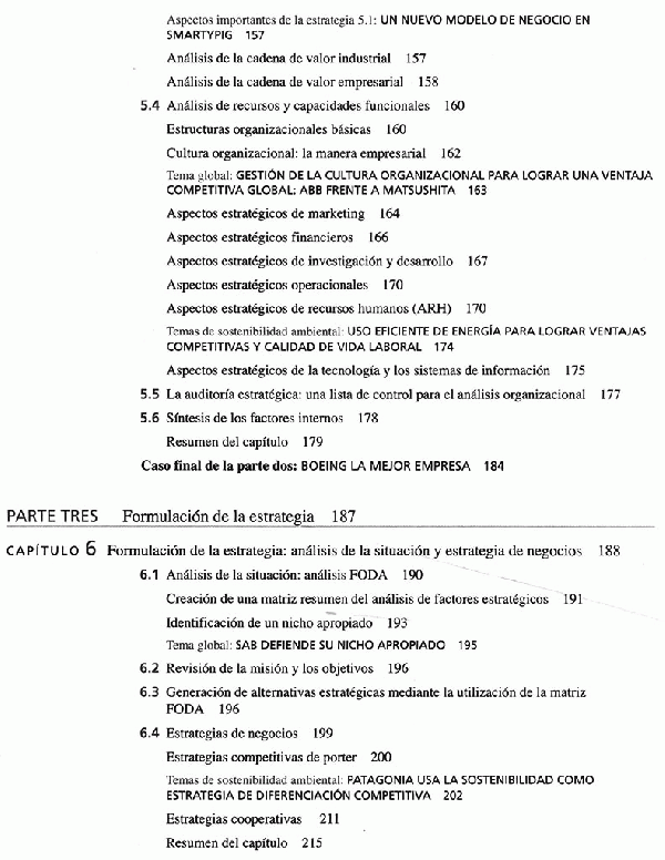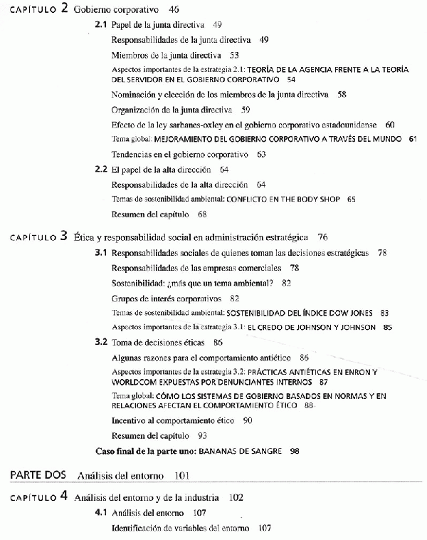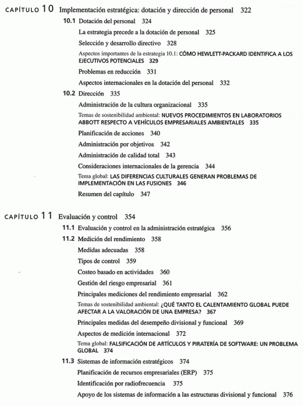 Contenido: Introducción a la administración estratégica y política de negocios. Gobierno corporativo. Ética y responsabilidad social en la administración estratégica. Análisis ambiental. Análisis interno: Análisis organizacional. Formulación de la estrategia: Análisis de situaciones y estrategia de negocios. Formulación de la estrategia: Estrategia corporativa. Formulación de la estrategia: Estrategia funcional y opción estratégica. Estrategia de implementación y control. Implementación de la estrategia: Dotación de personal y dirección. Evaluación y control. Introducción al análisis de casos.