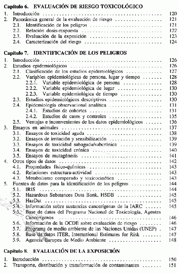 Resumen: Este libro persigue la finalidada de presentar el apasionante campo de la toxicología en su aplicación a la predicción de las repercusiones sobre la salud de la contaminación ambiental. Para conseguir este fin, el libro expone en primer lugar conceptos toxicológicos fundamentales para seguidamente analizar el contenido de la metodología de evaluación toxicológico de riesgos, cuya realización está configurándose como un de los elementos obligados en la caracterización de terrenos contaminados y en la negociación de niveles aceptables de descontaminación con las administración públicas.