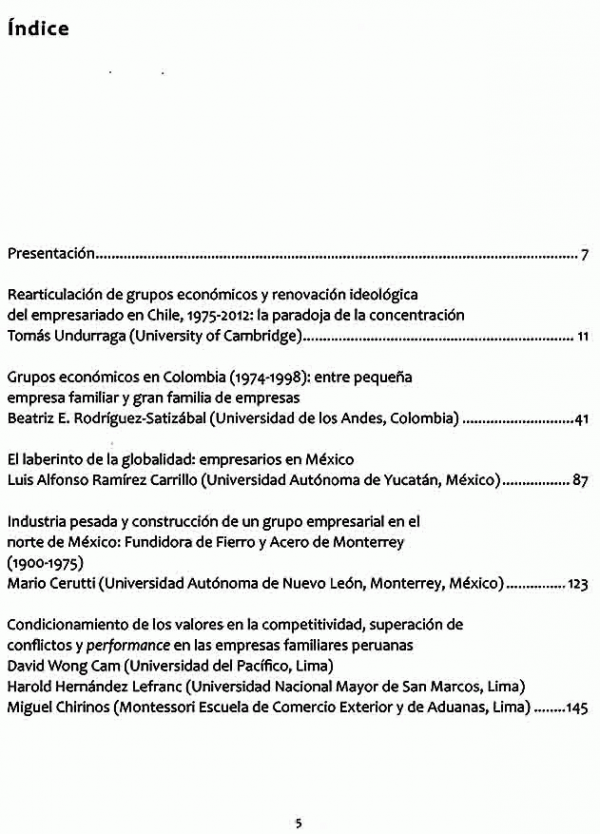 En este libro, la Sociología, la Historia, la Economía y las teorías empresariales se unen para estudiar dos temas clave en la economía y política de América Latina los grupos económicos y la mediana empresa familiar. Esta compilación de artículos se basa en estudios de caso por países para discutir los proyectos políticos de la élite económica en Chile, las características de los grupos económicos colombianos, la distinción entre grupo económico y grupo industrial en México (además de la trayectoria de los estudios empresariales en ese país) y las fortalezas y debilidades de las medianas empresas familiares en el Perú. En cada uno de los artículos el lector encontrará, además del análisis del caso particular, una discusión sobre los marcos analíticos y las taxonomías que se utilizan en nuestra región para discutir los temas ligados a grupos económicos y mediana empresa familiar.