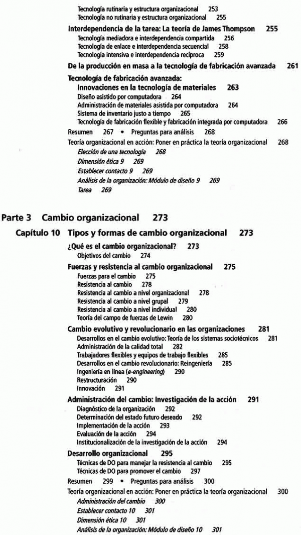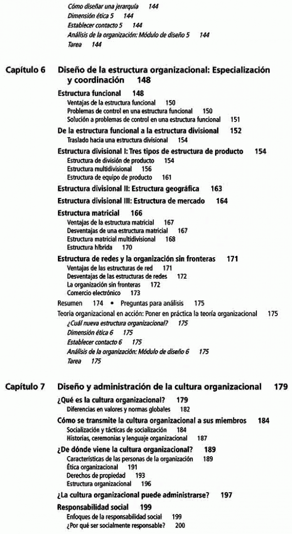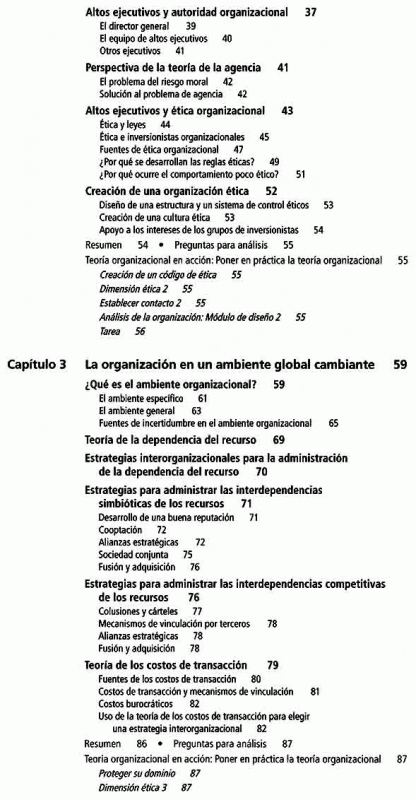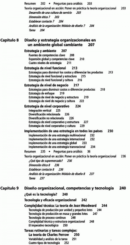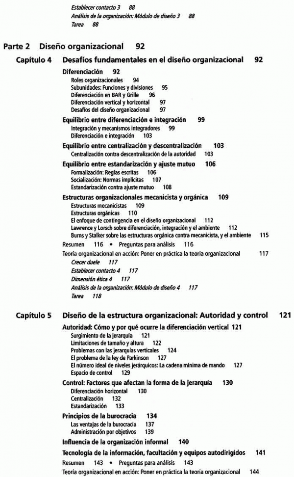 El contenido de la obra se centra en los principios de la teoría y diseño organizacionales vinculados a la práctica, con la finalidad de plantear las razones por las cuales las compañías necesitan analizar y cambiar sus estrategias y estructuras para así aumentar su eficacia con el transcurso del tiempo.