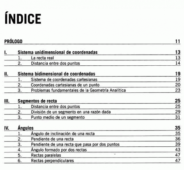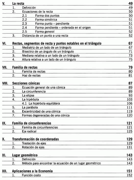 El presente texto comprende los temas correspondientes a la Geometría Analítica bidimensional. Entre los más importantes figuran: las ecuaciones de la recta y de las cónicas, problemas del lugar geométrico, traslación y rotación de ejes, y aplicaciones a la administración y a la economía.