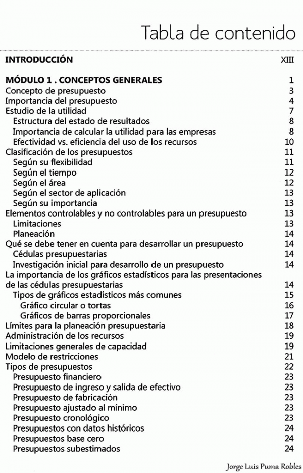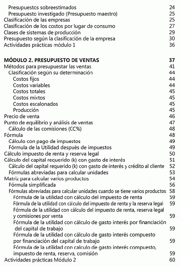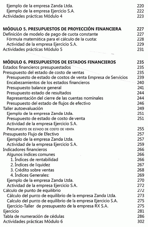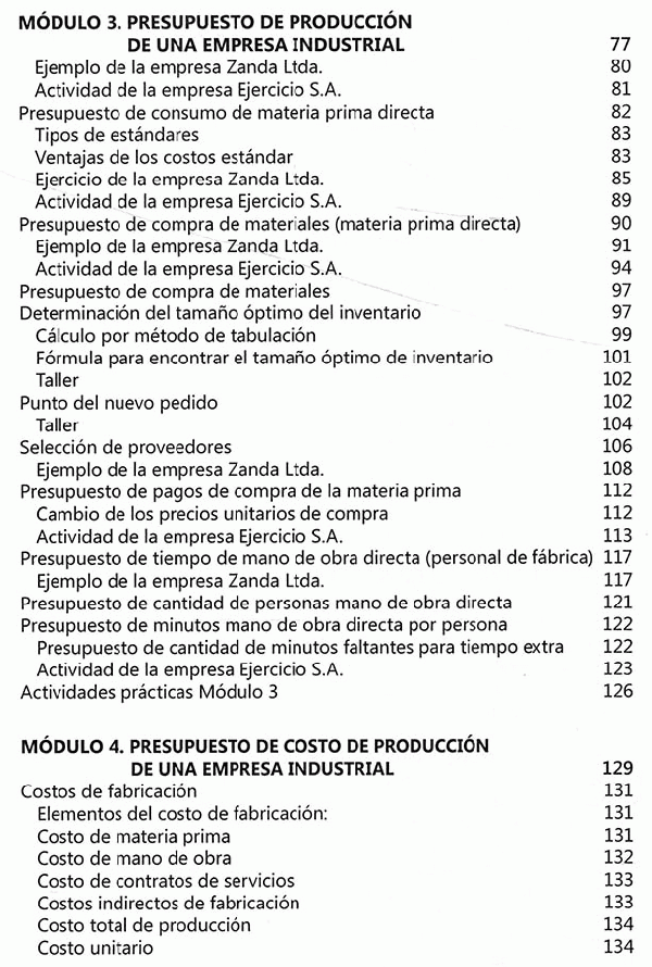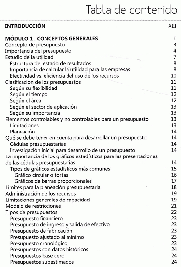 El presupuesto ofrece un análisis sistemático del presente y futuro de un proceso comercial, productivo y financiero de una empresa, calculando los input y los output de los recursos, siendo estos: dinero, tiempo, materiales, uso de maquinaria y de espacio, entre otros. Un presupuesto debe entregar, como resultado, indicadores financieros sobre la cantidad y el costo de los recursos requeridos para desarrollar un producto, así como datos concretos sobre su rentabilidad, la utilidad esperada y el flujo de efectivo. El presupuesto es un punto de partida de primordial importancia, para analizar la manera en que se desarrollará el proceso empresarial y económico, de un nuevo período o proyecto. Su estudio ayudará a prever problemas y dar soluciones anticipadas, así como analizar dificultades logísticas, económicas e identificar los puntos en que se debe buscar financiación y calcular la forma de pago para llegar a un equilibrio deseado. Ante todo, el presupuesto es el fiscalizador de la meta empresarial y antepone los controles debidos para cumplir con los objetivos previamente establecidos. Este libro ofrece un material de estudio práctico, expuesto dé manera sencilla, con conceptos, ejercicios y didácticas aplicativas para que los estudiantes puedan "aprender haciendo" de todos los elementos esenciales sobre en entidades industriales, de servicios y comerciales. Contiene información sobre cada uno de los elementos que comprenden un presupuesto maestro, con los conceptos y un ejemplo que se desarrolla de manera continua en cada uno de los módulos, así como un ejercicio alterno que atraviesa la totalidad de la obra e incluye los contenidos aprendidos en cada módulo. Adicional mente, trae excelentes complementos virtuales en el Sistema de Información en Línea, SIL, uno para los estudiantes y otro que sirve de apoyo a los docentes.