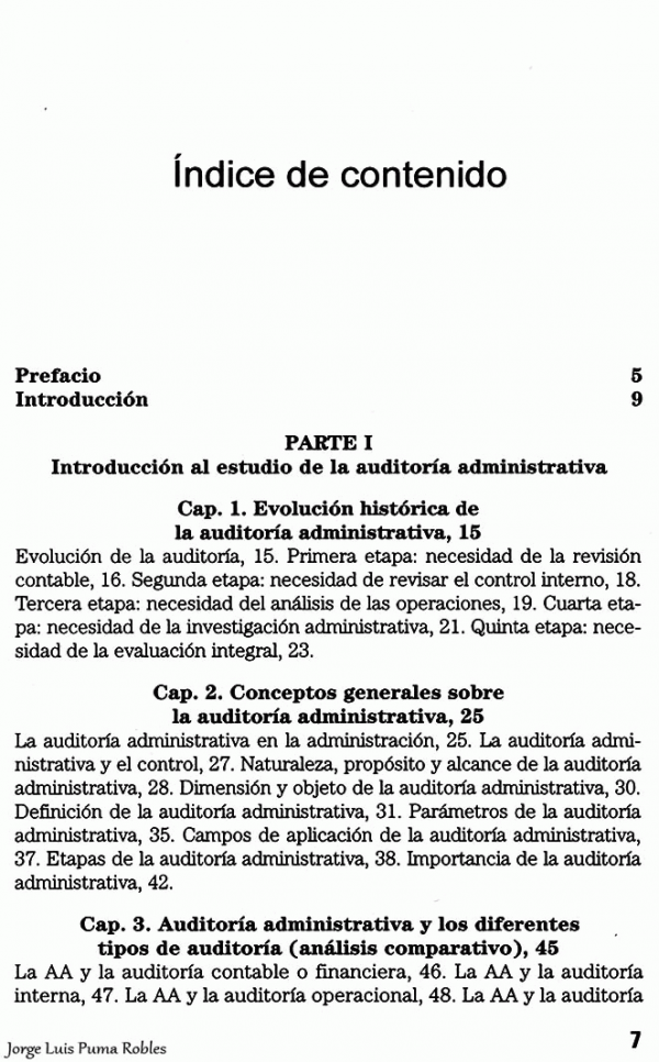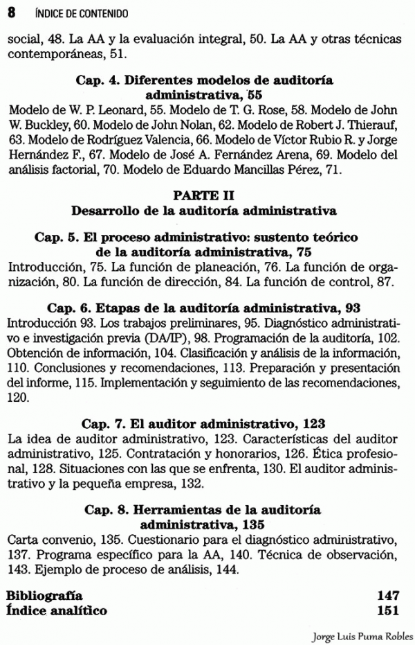 Contenido: Prefacio. -- Introducción. -- Parte I. Introducción al estudio de la auditoria administrativa: Cap. 1. Evolución histórica de la auditoria administrativa, 15.-- Cap 2. Conceptos generales sobre la auditoria administrativa, 25. -- Cap. 3. Auditoria de administrativa y los diferentes tipos de auditoria ( análisis comparativo ), 45. -- Cap. 4. Diferentes modelos de auditoria administrativa, 55. -- Parte II. Desarrollo de la auditoria administrativa: Cap. 5. El proceso administrativo: Sustento teórico de la auditoria administrativa, 75. -- Cap. 6. Etapas de la auditoria administrativa, 93. -- Cap. 7. El auditor administrativo, 123. -- Cap. 8. Herramientas de la auditoria administrativa, 135. -- Bibliografía. -- Indice analítico.