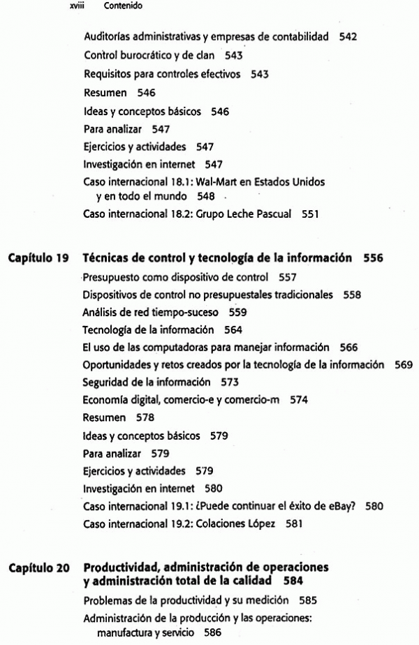 Este libro mantiene su orientación internacional aplicada al entorno de los negocios del siglo XXI. La obra clasifica el conocimiento general de acuerdo con las funciones de planear, organizar, integrar personal, dirigir y controlar, todas integradas en un modelo de sistema abierto, que permite enfrentar los desafíos de la internacionalización y la comunicación por internet.