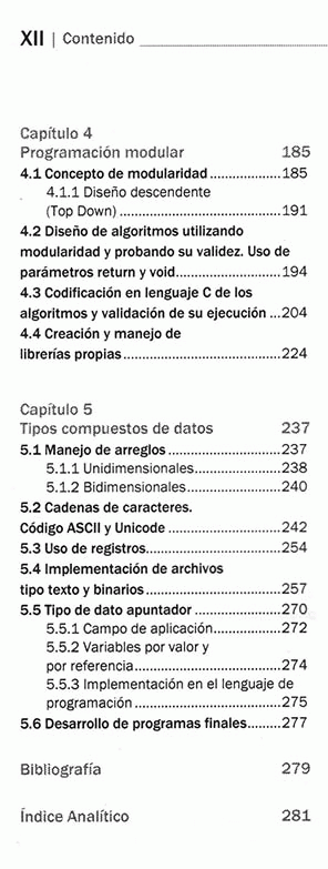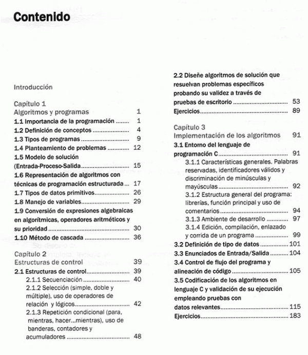 La presente obra representa una herramienta de estudio para el diseño de algoritmos y su traducción a lenguaje C. Explica las técnicas básicas para el diseño de algoritmos que todo programador debe seleccionar y adoptar en un momento de su trayectoria, ya sea en el ámbito profesional.