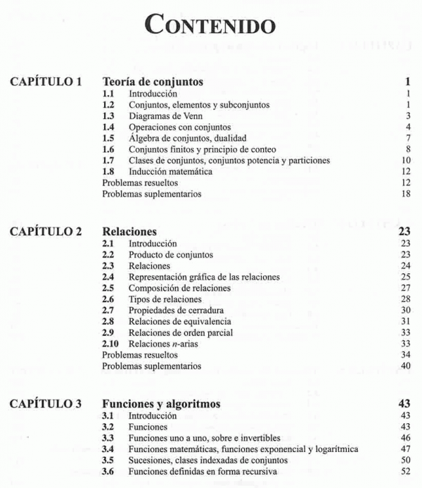 Este libro cumple los requisitos de un curso formal de matemáticas discretas. También es muy útil como complemento de cualquier texto que se utilice para esta materia. Los tres primeros capítulos cubren conjuntos, relaciones y funciones, y algoritmos.Posteriormente se estudian los capítulos sobre lógica, conteo y probabilidad. A continuación hay tres capítulos sobre teoría de gráficas, gráficas dirigidas y árboles binarios. Por último, hay capítulos individuales sobre propiedades de los enteros, lenguajes, máquinas, conjuntos ordenados y retículas, y álgebra booleana, así como apéndices sobre vectores y matrices, y sistemas algebraicos.