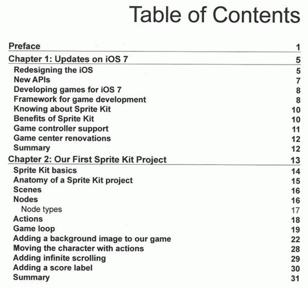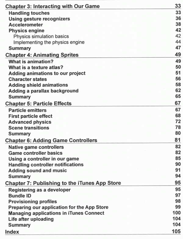 El libro es una guía práctica, basada en ejemplos, donde aprenderá cómo hacer un juego desde cero y cómo desarrollar juegos en la plataforma iOS. Si tienes grandes ideas para juegos y quieres aprender sobre el desarrollo de juegos iOS, entonces este libro es la opción correcta para ti. Estar familiarizado con el desarrollo de iOS es una ventaja, pero no es obligatorio. Con la ayuda de este libro, gradualmente podrá familiarizarse con el nuevo marco de Sprite Kit.