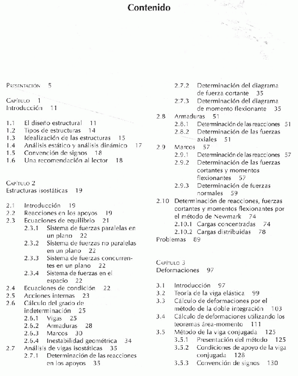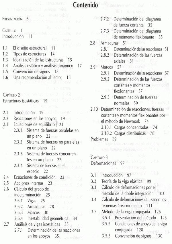 Este libro ha sido escrito con el propósito fundamental de ayudar a profesores y alumnos en la enseñanza y el aprendizaje del análisis estructural. Esta disciplina constituye uno de los pilares de la carrera de ingeniería civil y es también importante en algunas otras licenciaturas, como ingeniería mecánica y arquitectura. Su dominio es indispensable para los profesionales que se dedican al diseño de algunas de las obras más espectaculares que construye el ser humano: rascacielos, puentes, presas, plantas industriales, plataformas marítimas, etc. En todo el libro se hace énfasis en los principios básicos más que en aplicaciones específicas, ya que el autor considera que el dominio de estos principios es necesario para el estudio de métodos más avanzados o para la utilización de los excelentes programas de cómputo disponibles actualmente.