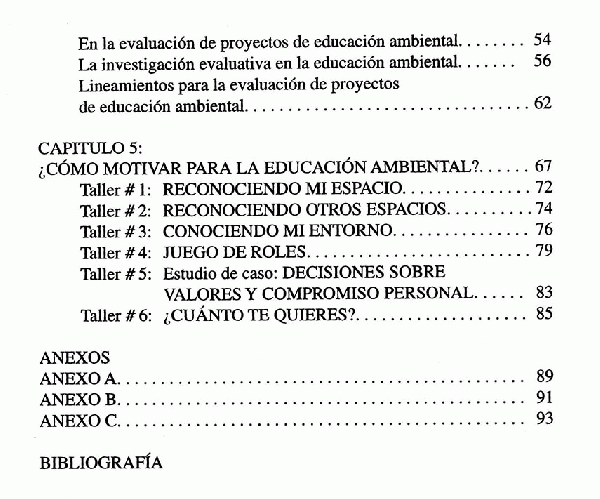 | 372.357 / A66 Ecología para Niños / [Impreso] | 372.357 / LL756 Interacción Naturaleza-Sociedad en el Ciclo Medio / [Impreso] | 372.357 / M38 Teoría y Práctica de la Educación Ambiental / [Impreso] | 372.357 / P36 Lineamientos para Formadores en Educación Ambiental / [Impreso] | 372.357 / Z76 Ecopedagogía para el Nuevo Milenio / [Impreso] | 372.358 / S73 Nuevas Tecnologías para la Educación Infantil y Primaria / [Impreso] | 372.372 / E71 Quiero Saber: [Impreso] Educación Sexual para Niños / |